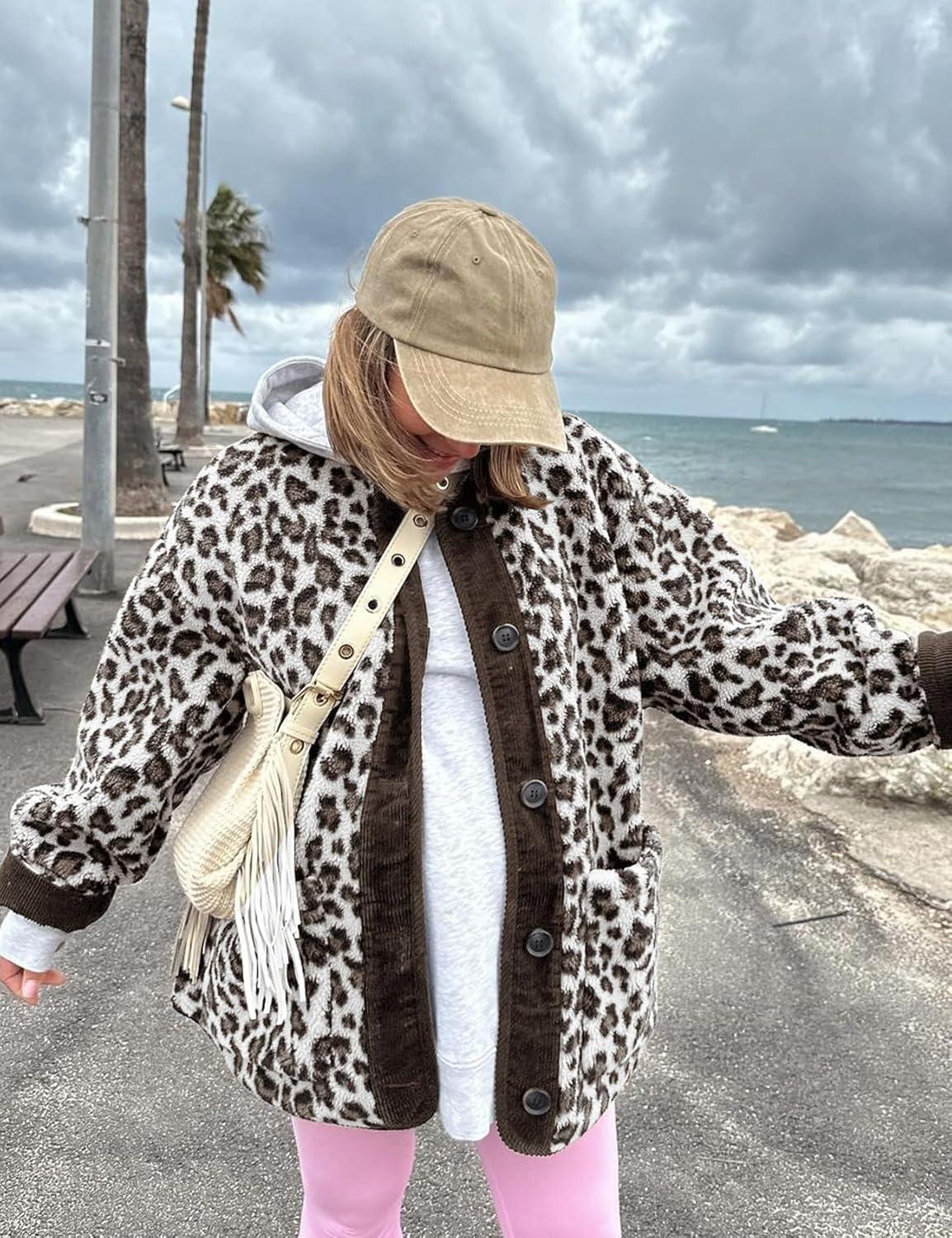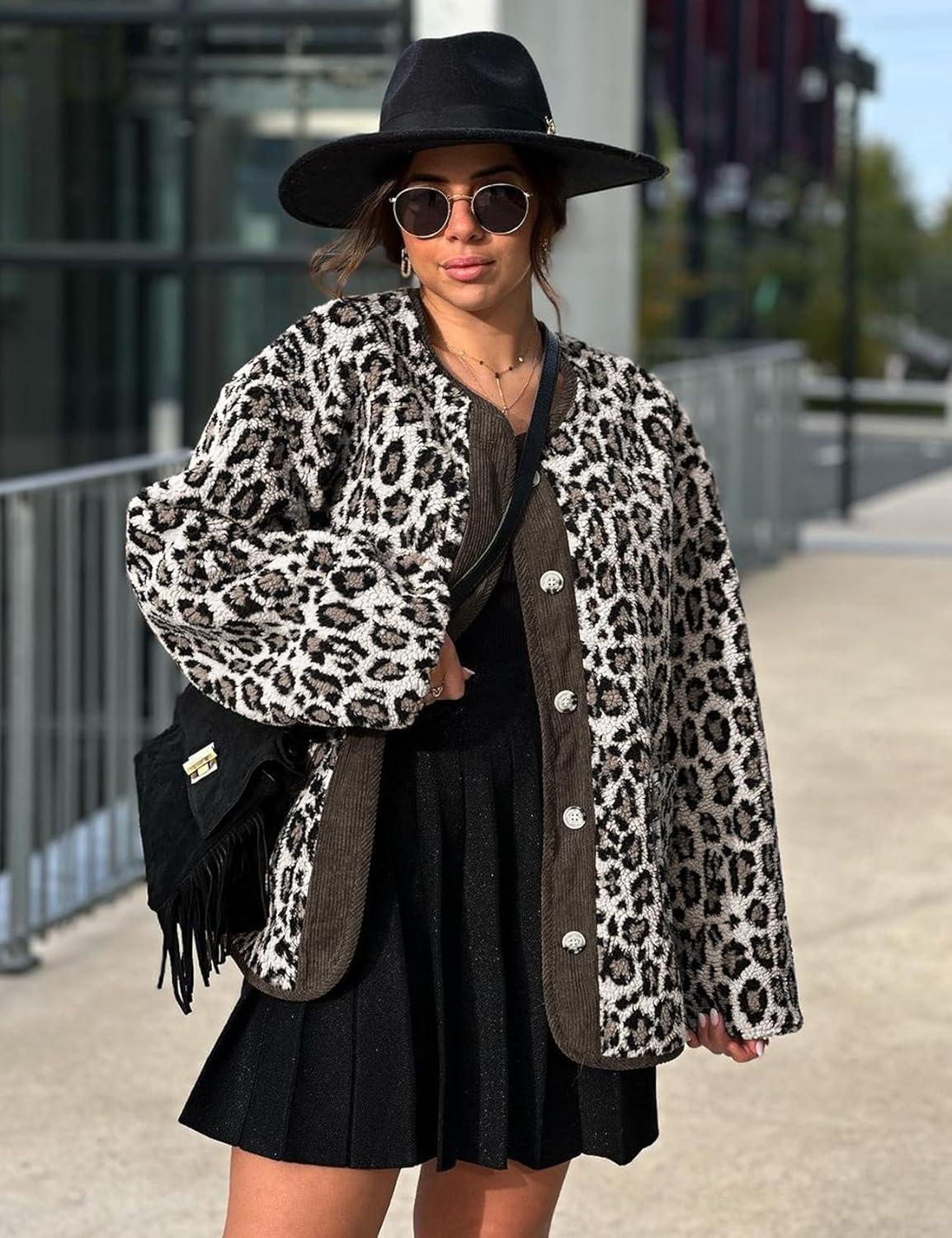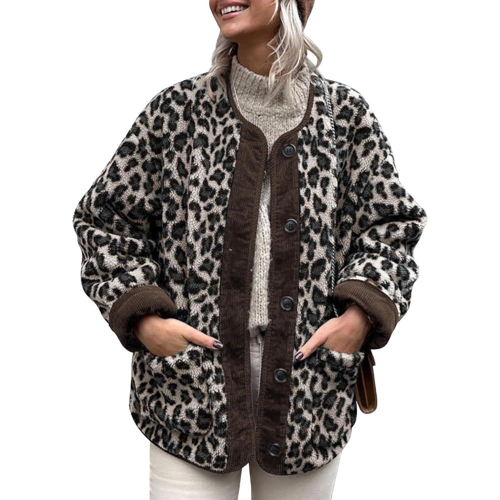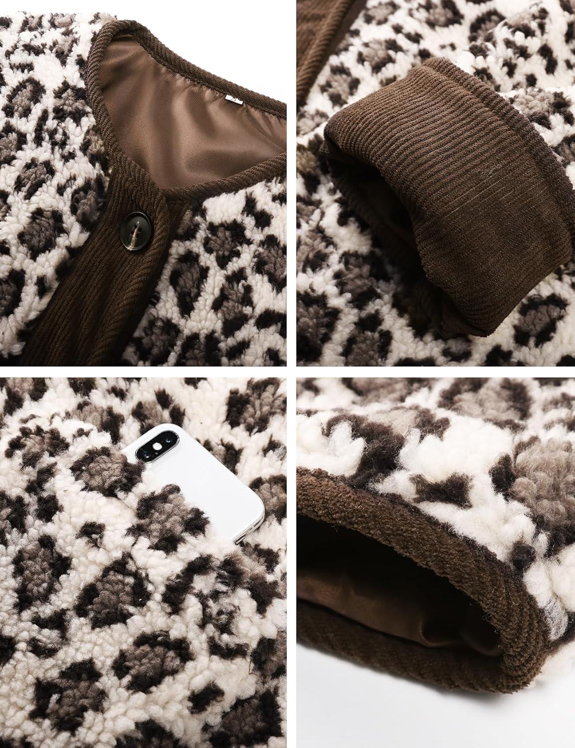 Flygo Women’s Leopard Fuzzy Fleece Jacket Casual Corduroy Patchwork Long Sleeve Button Down Winter Coat Outerwear with Pocket(Khaki Grey)