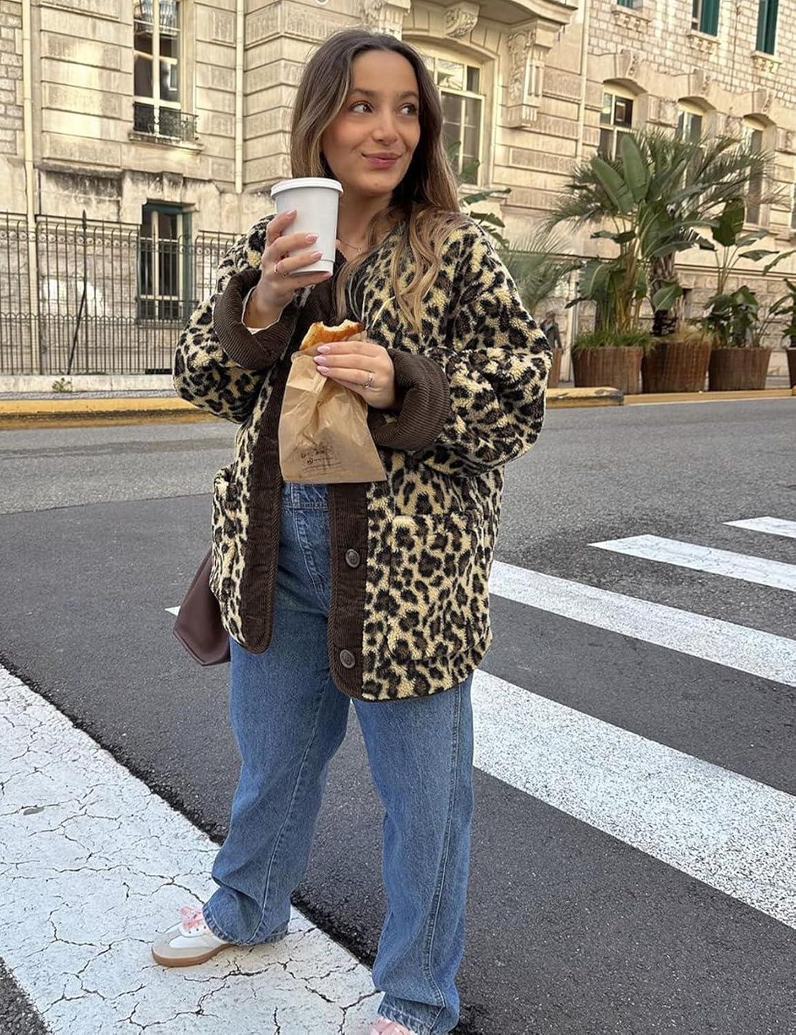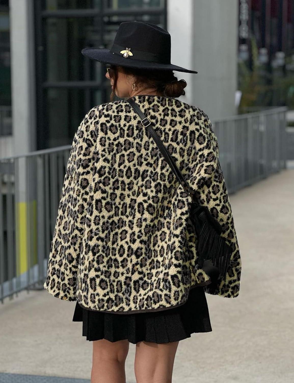 Flygo Women’s Leopard Fuzzy Fleece Jacket Casual Corduroy Patchwork Long Sleeve Button Down Winter Coat Outerwear with Pocket(Beige Grey)