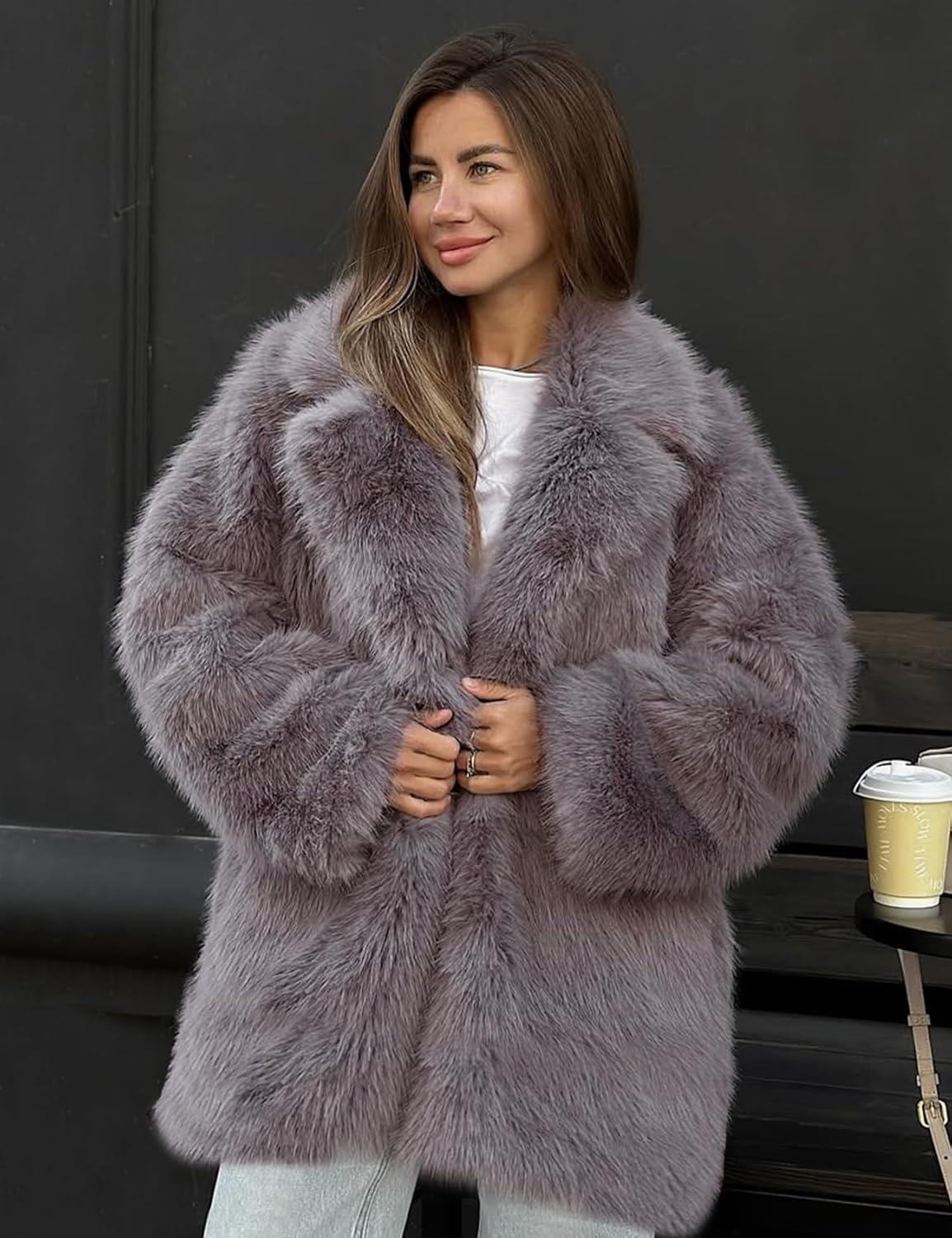 Flygo Womens Long Faux Fur Coats Fluffy Faux Fur Jacket Long Sleeve Lapel Furry Coats Fuzzy Winter Jacket(Taupe)