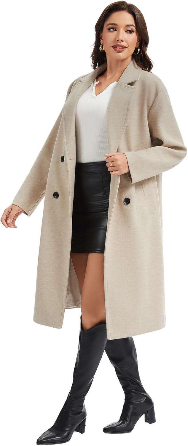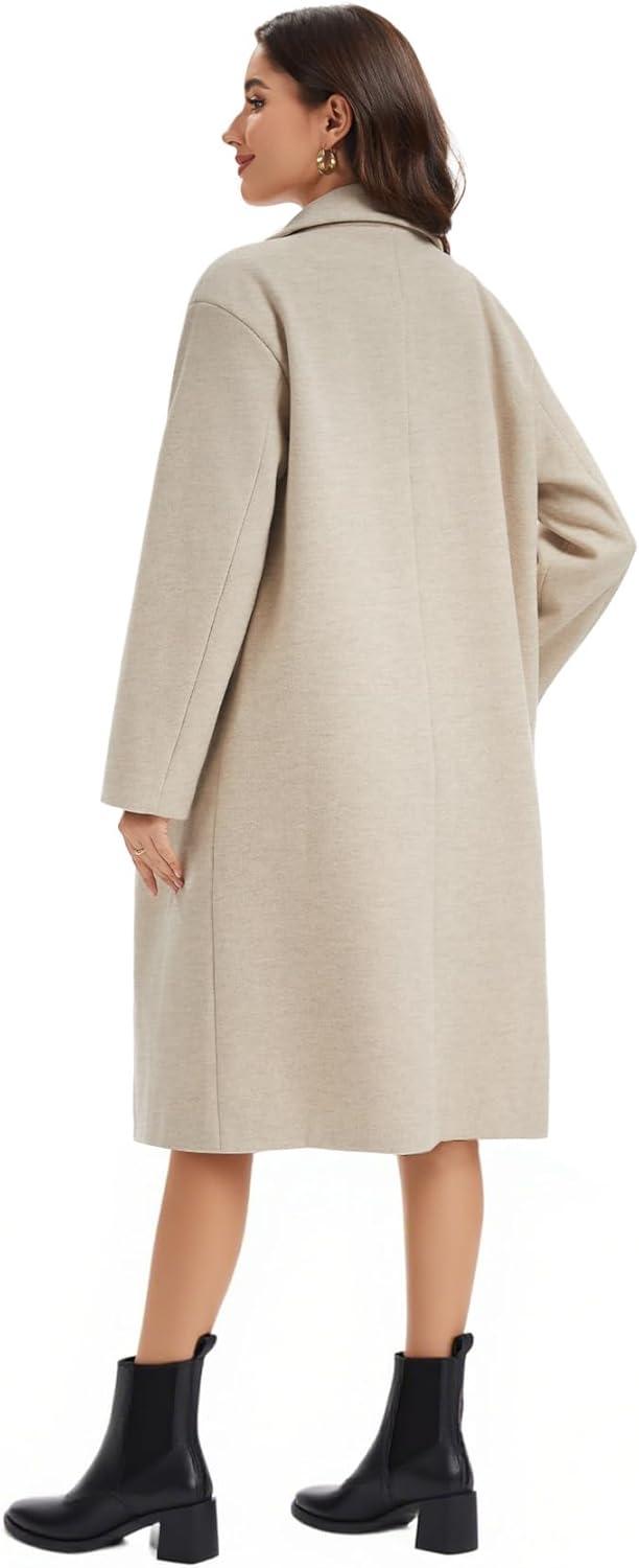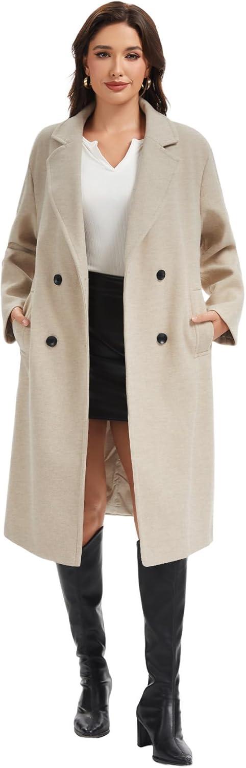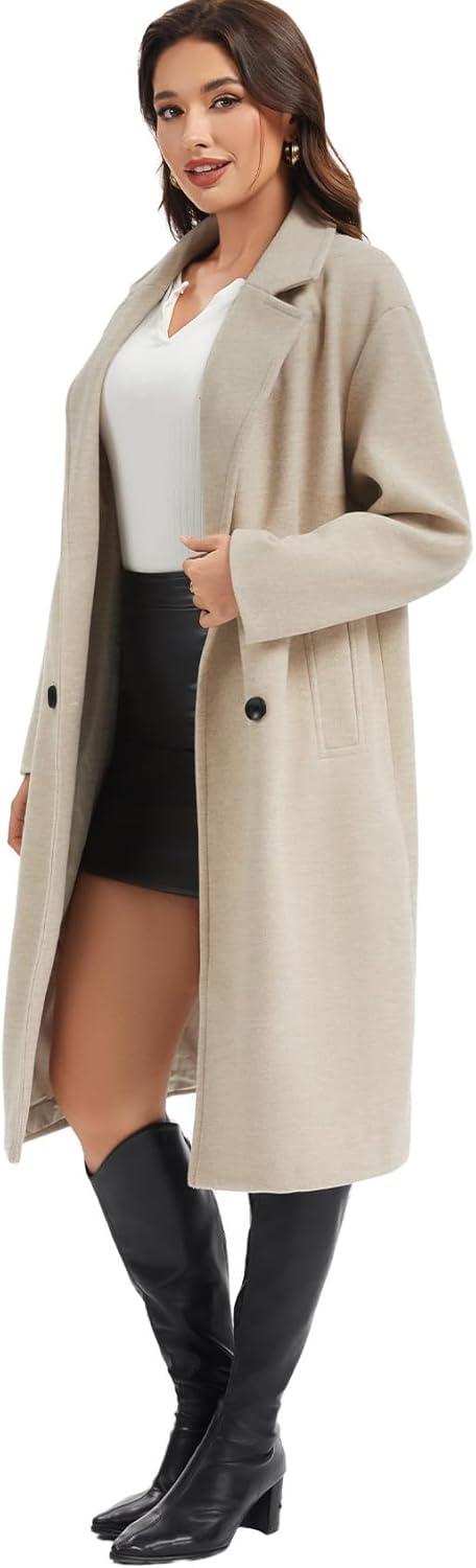 Flygo Womens Long Pea Coat Notch Lapel Double Breasted Trench Coat Fall Winter Overcoat Long Jacket(Oatmeal)