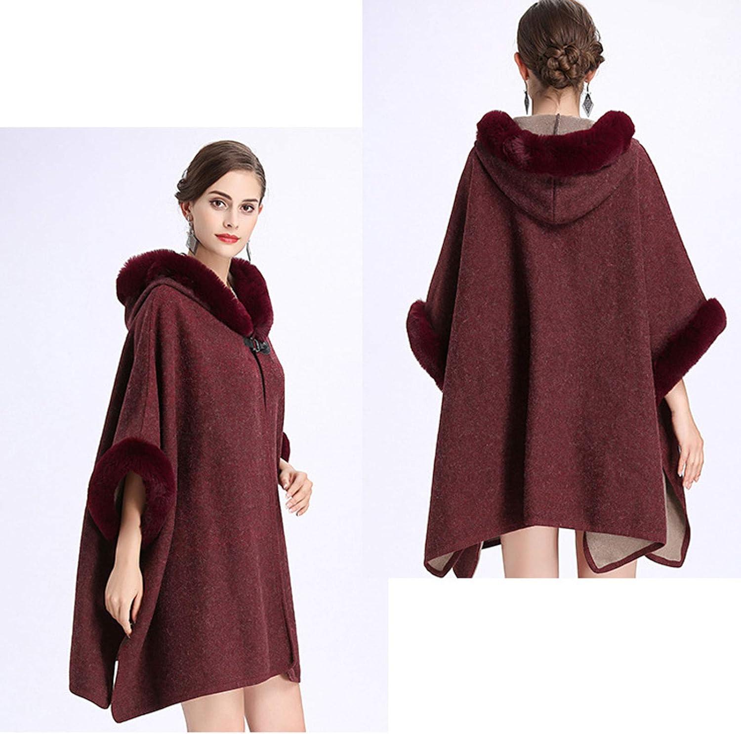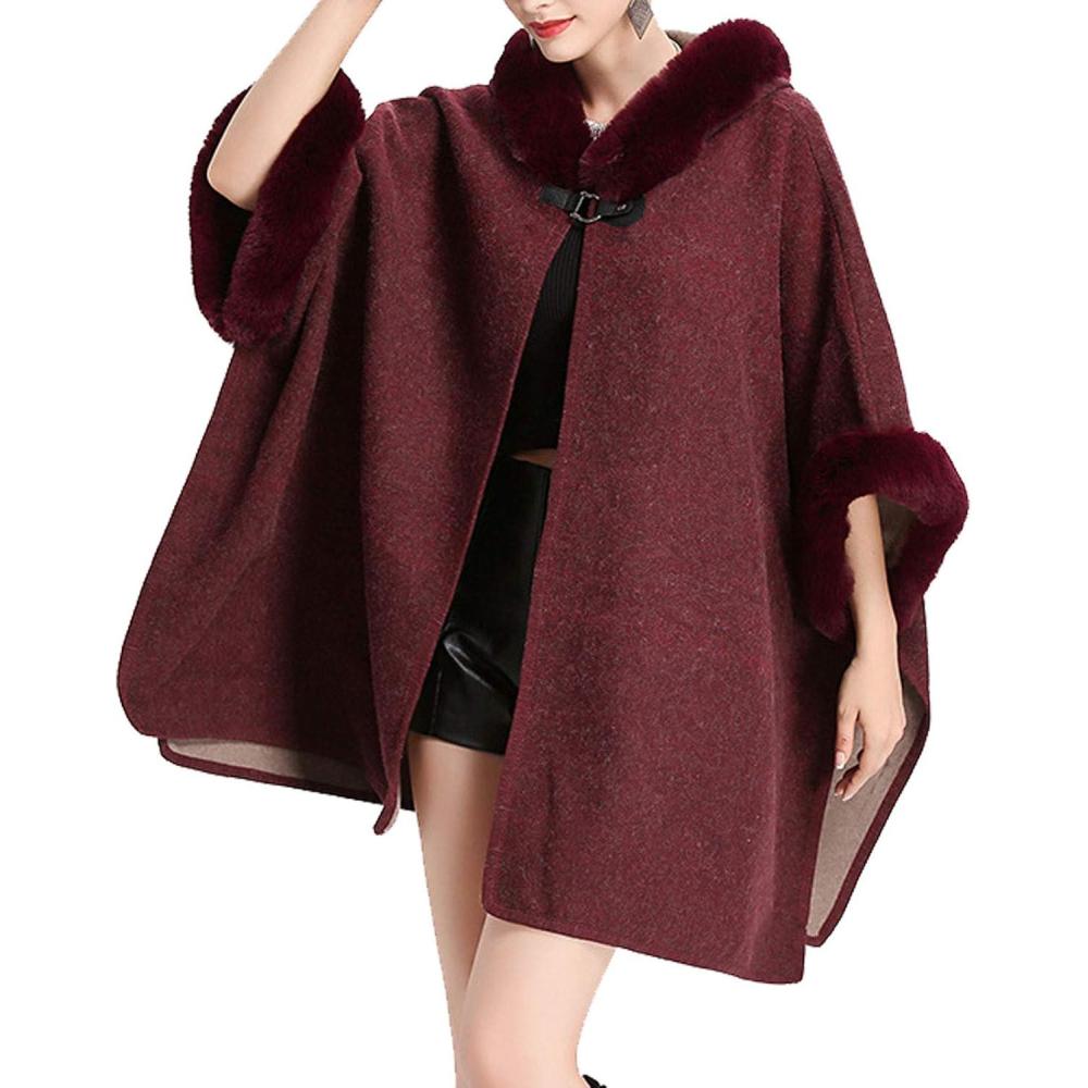 Flygo Women’s Luxury Batwing Sleeve Faux Fur Hooded Cloak Poncho Sweater Cape Outwear(Wine Red)