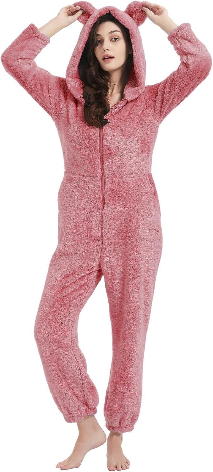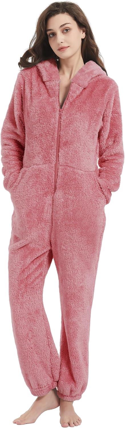 Flygo Womens Onesies Pajamas One Piece Hooded Adult Pajama Jumpsuit Winter Fuzzy Sleepwear(Pink)