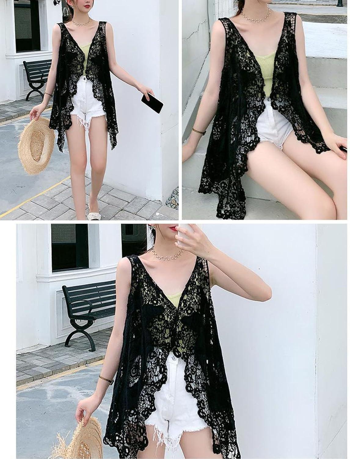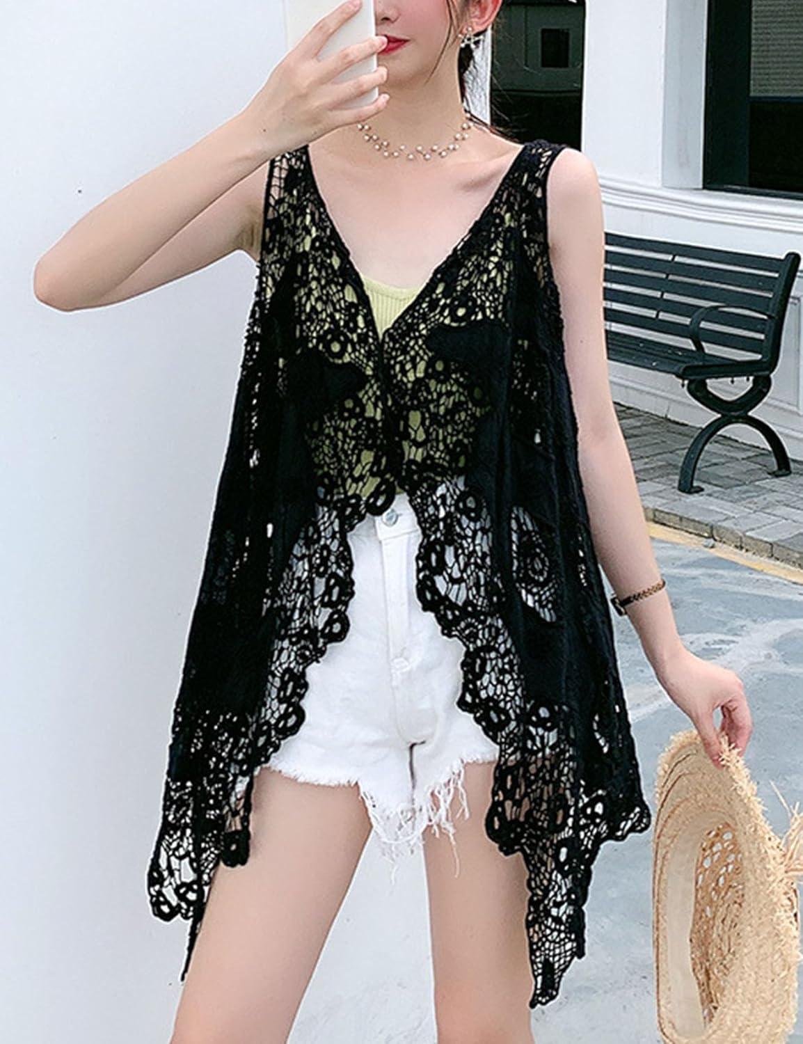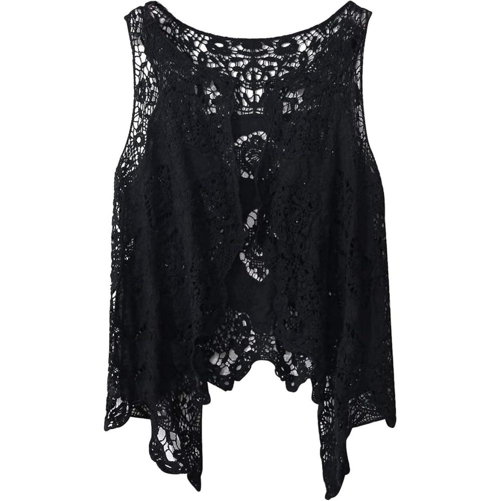 Flygo Women’s Open Front Cotton Crochet Lace Boho Hippie Butterfly Vest Cardigan Coverup Sleeveless Irregular Hem(Black)