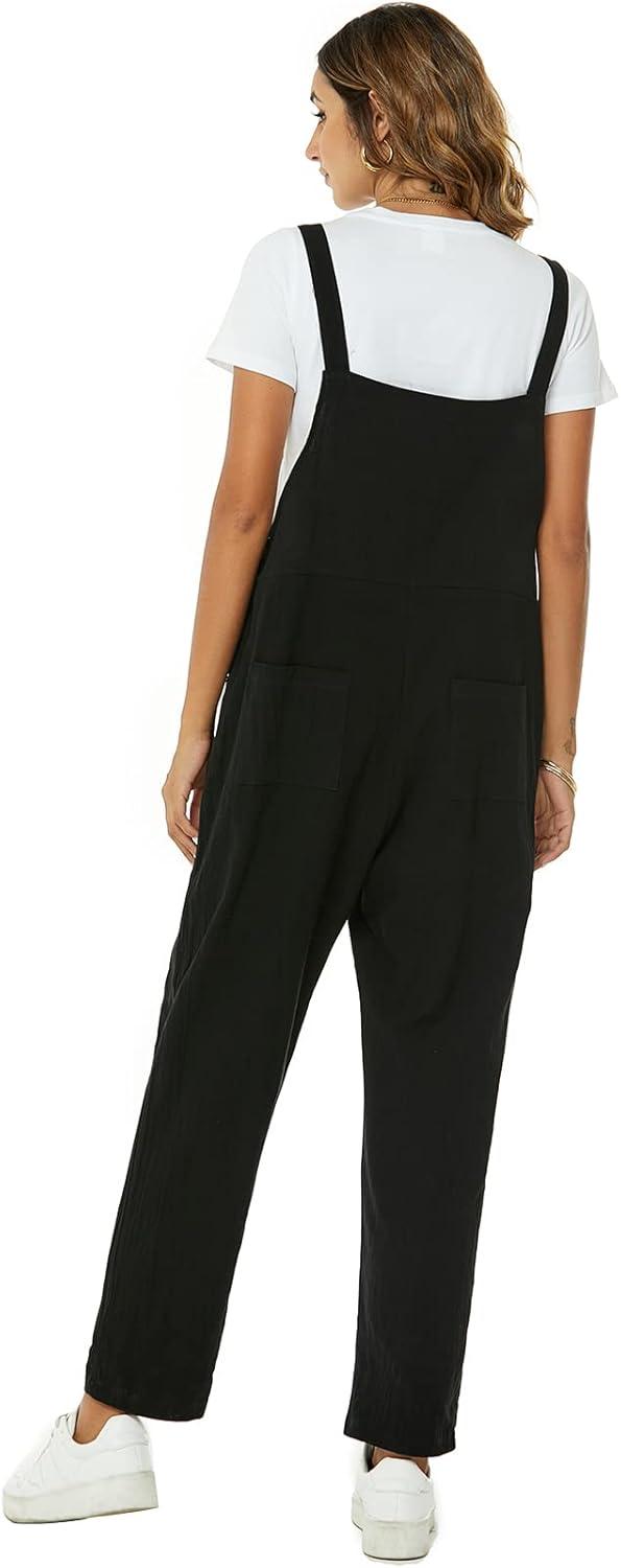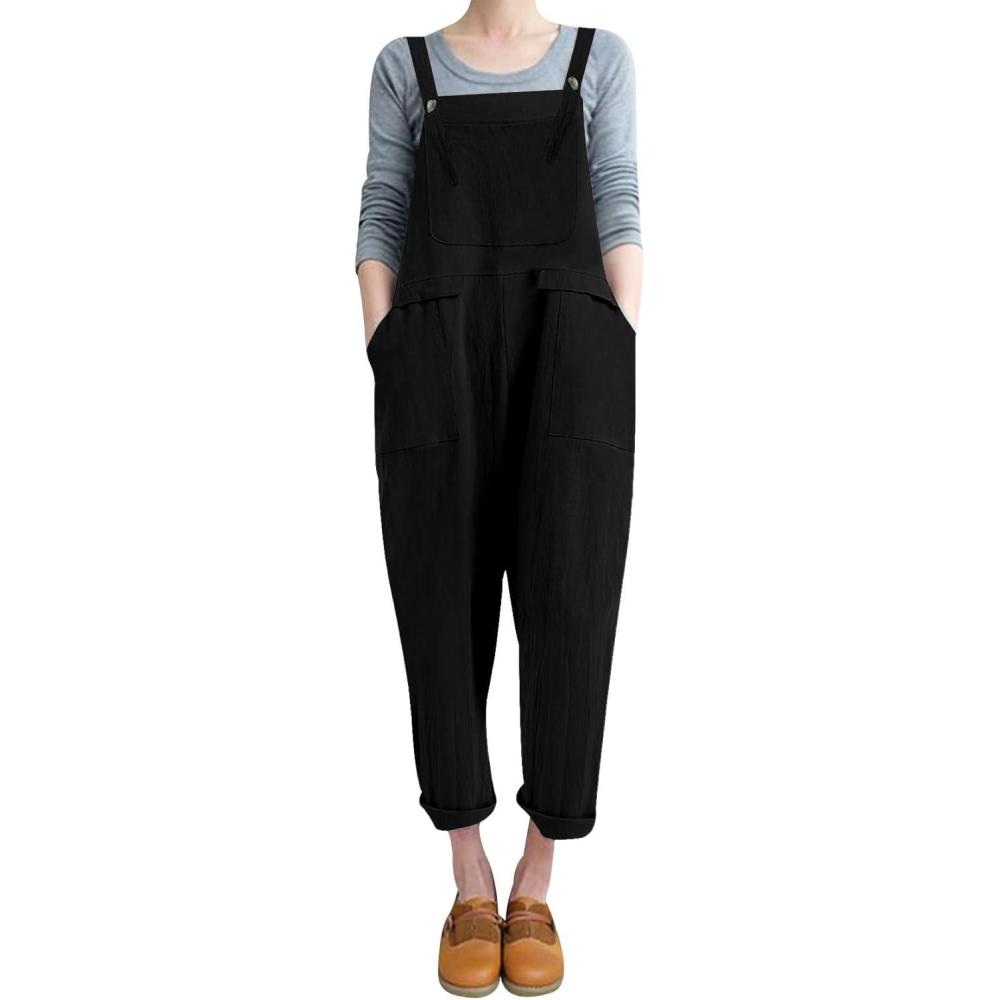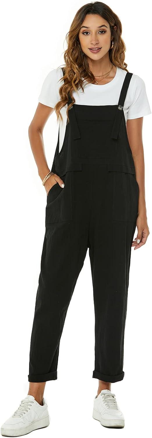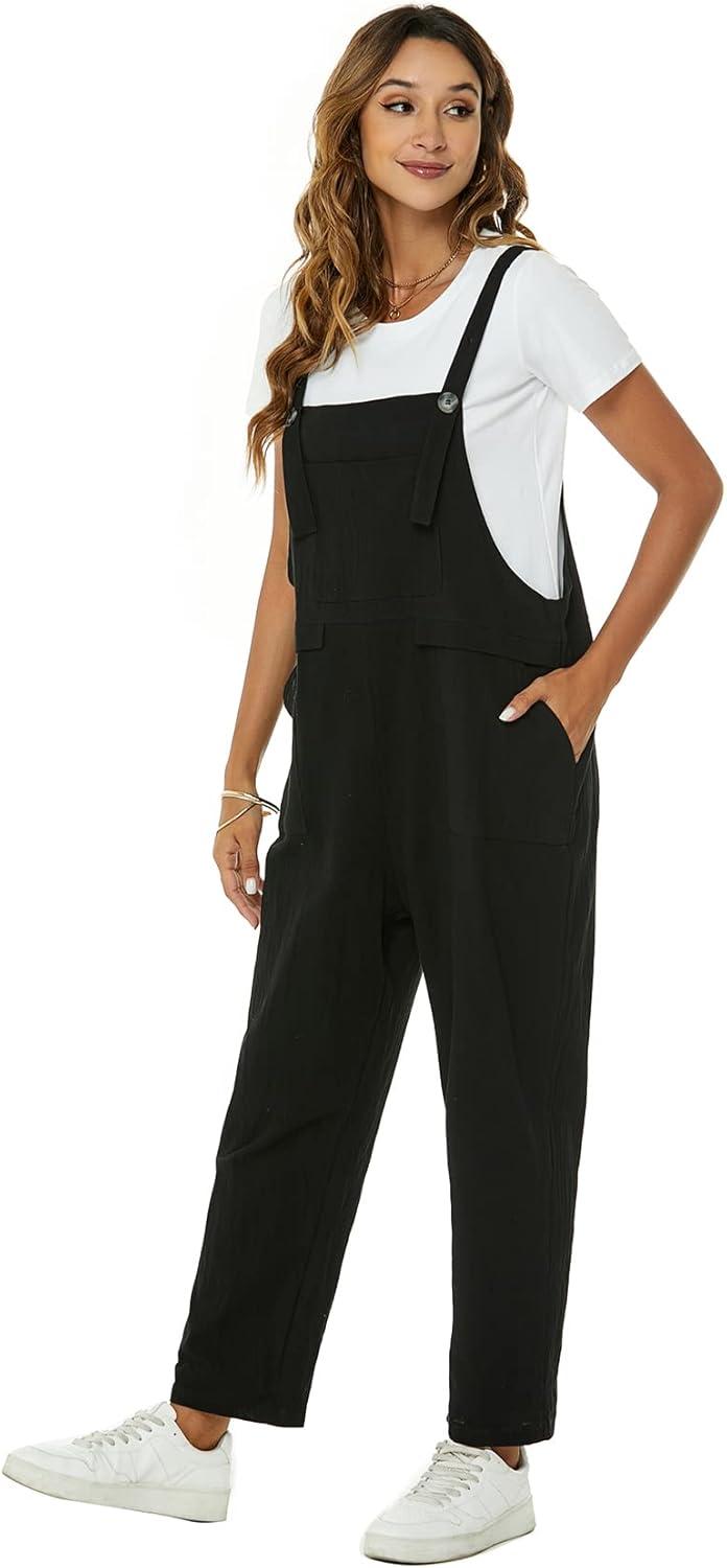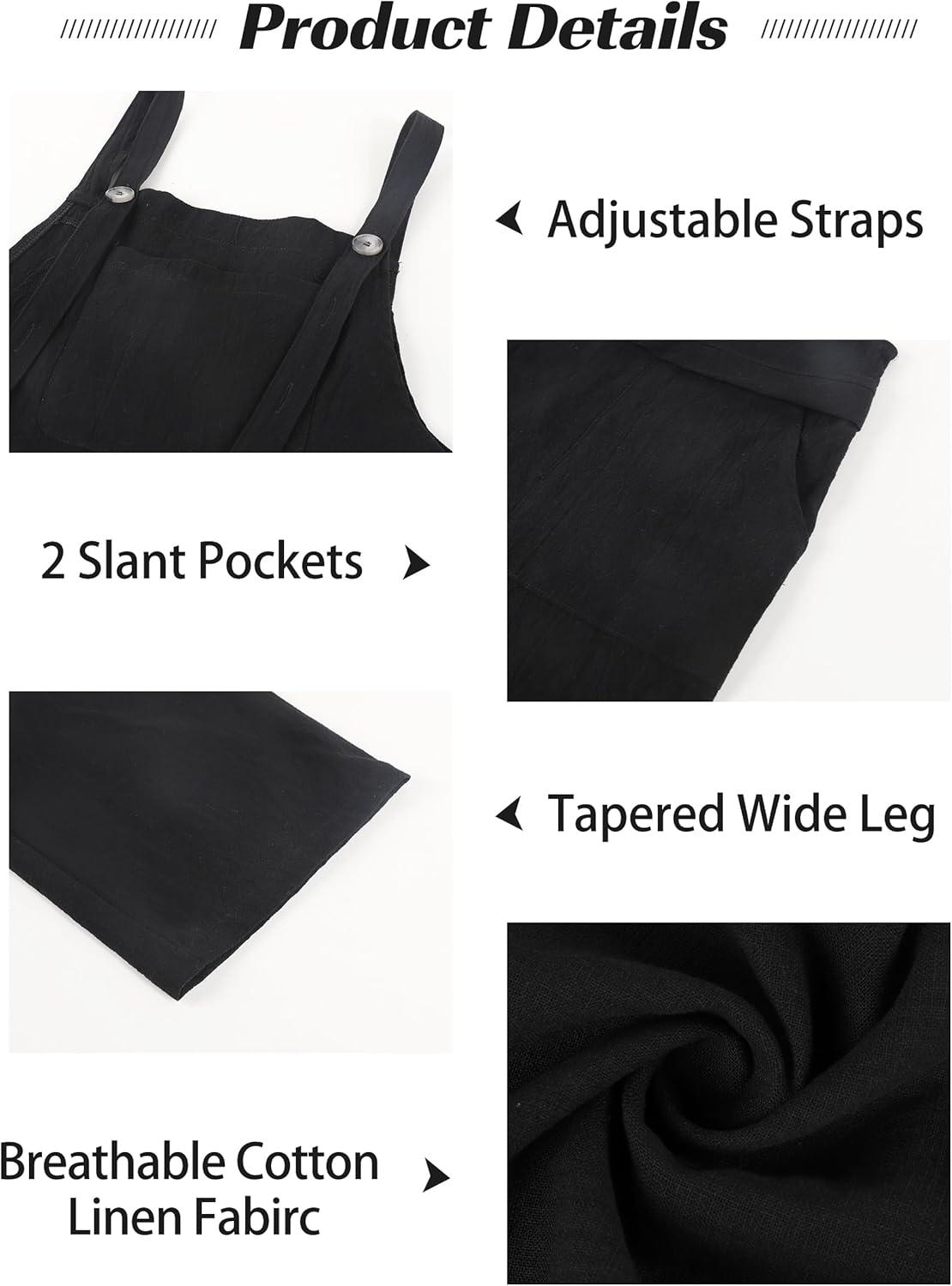 Flygo Womens Overalls Cotton Linen Overalls for Women Loose Fit Harem Wide Leg Jumpsuit with Pockets(Black)