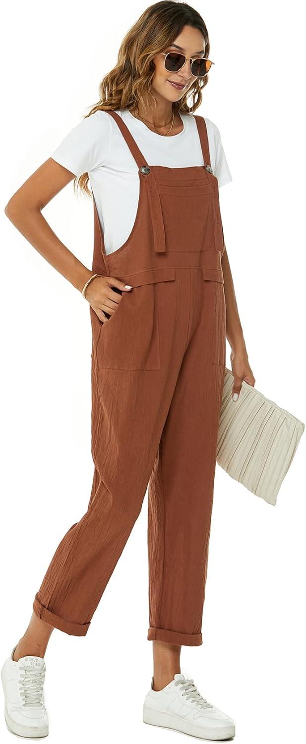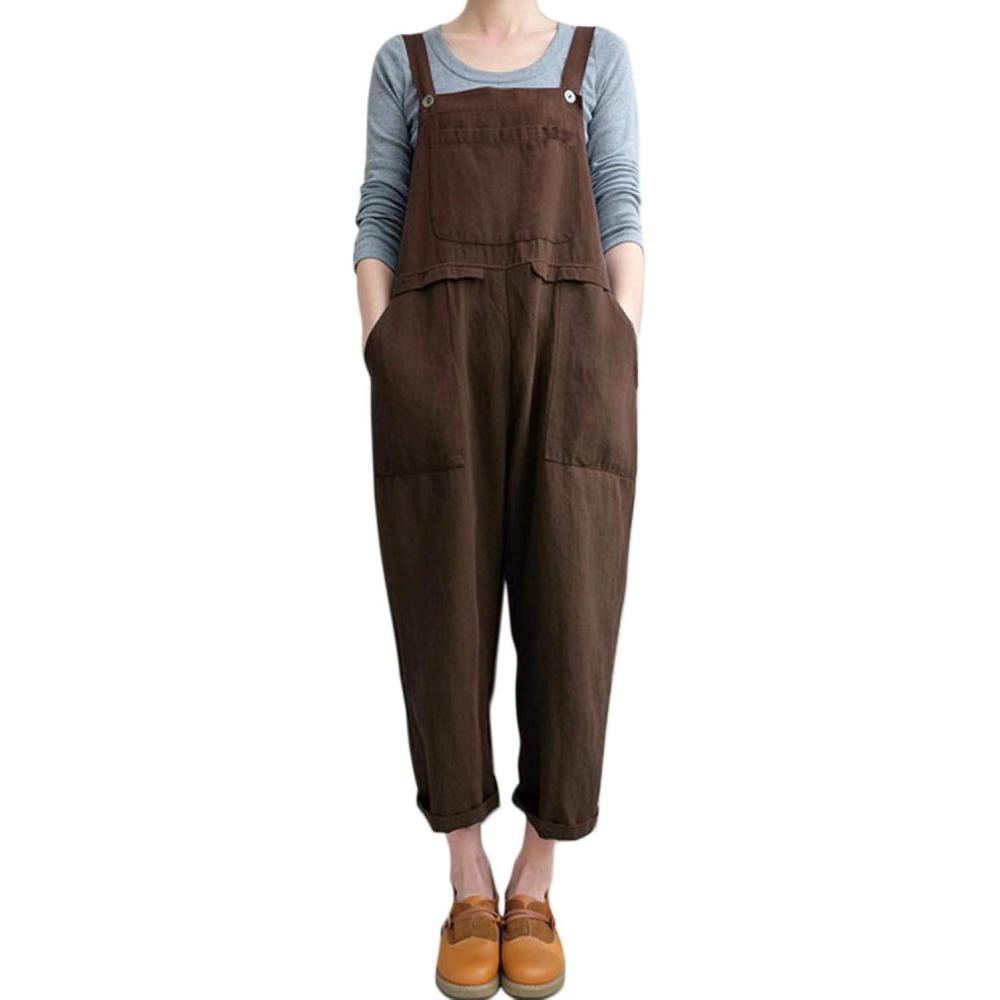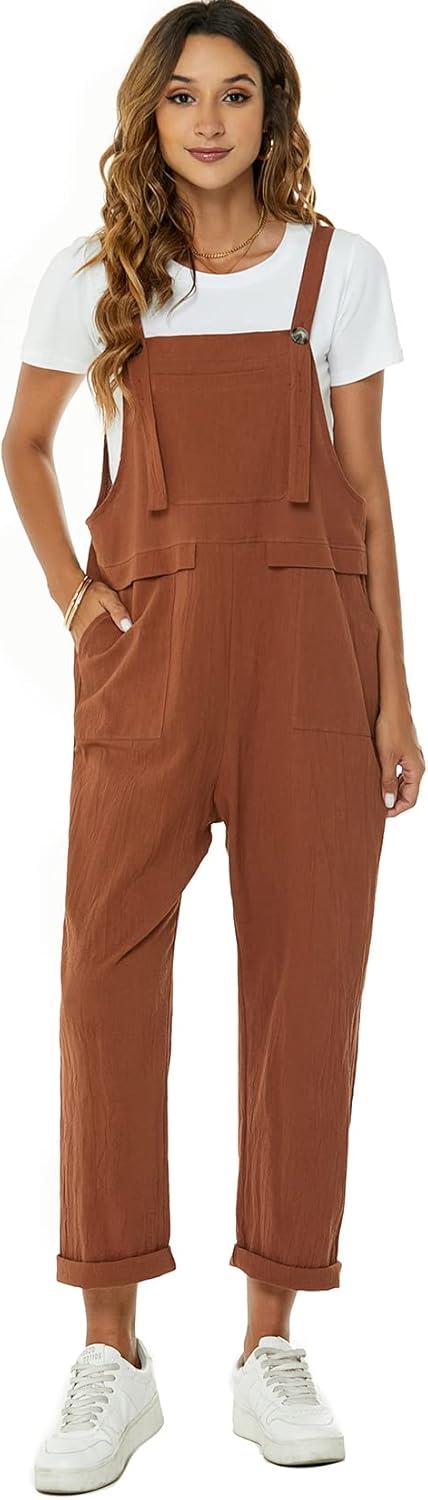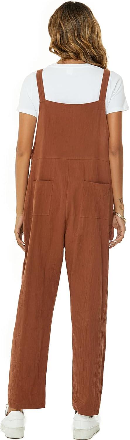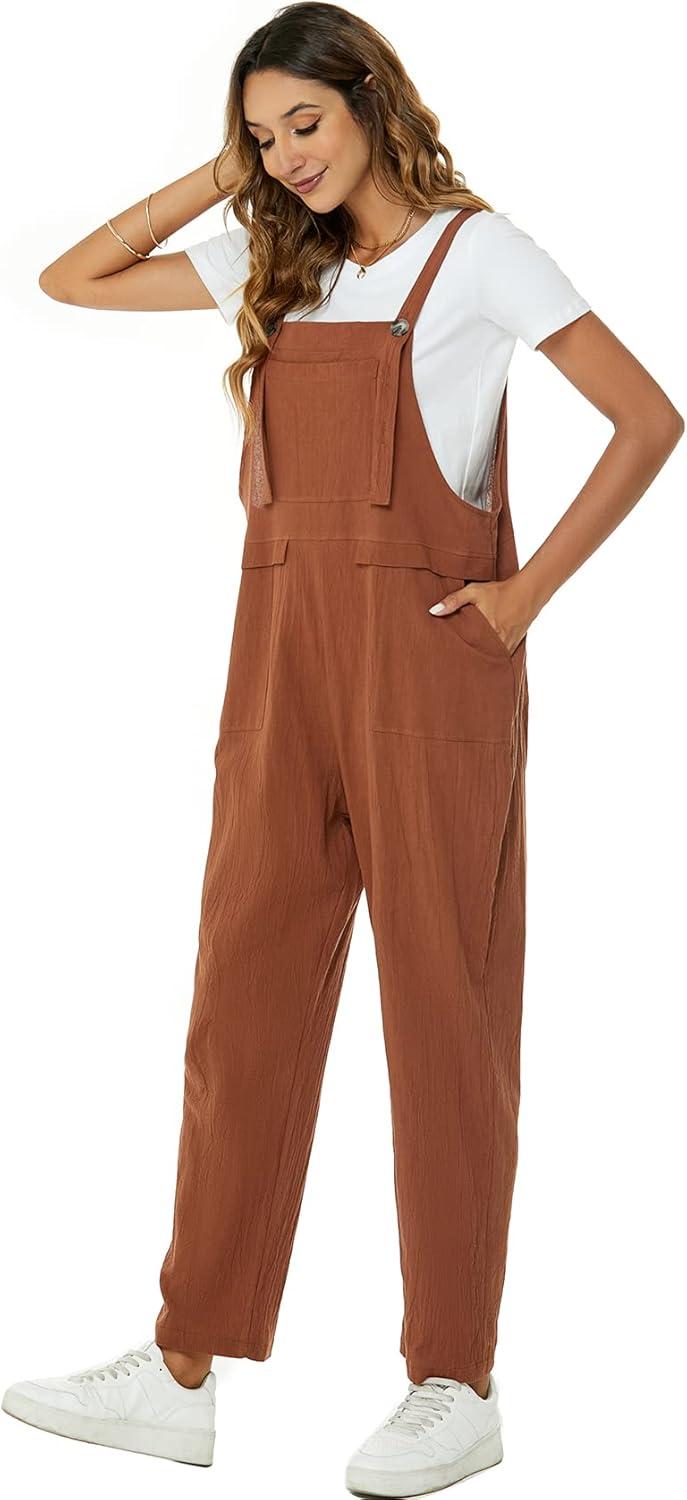 Flygo Womens Overalls Cotton Linen Overalls for Women Loose Fit Harem Wide Leg Jumpsuit with Pockets(Brown)