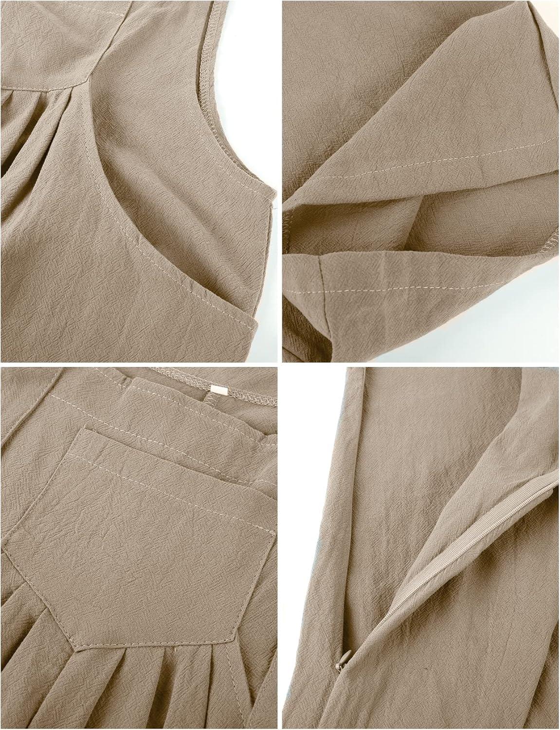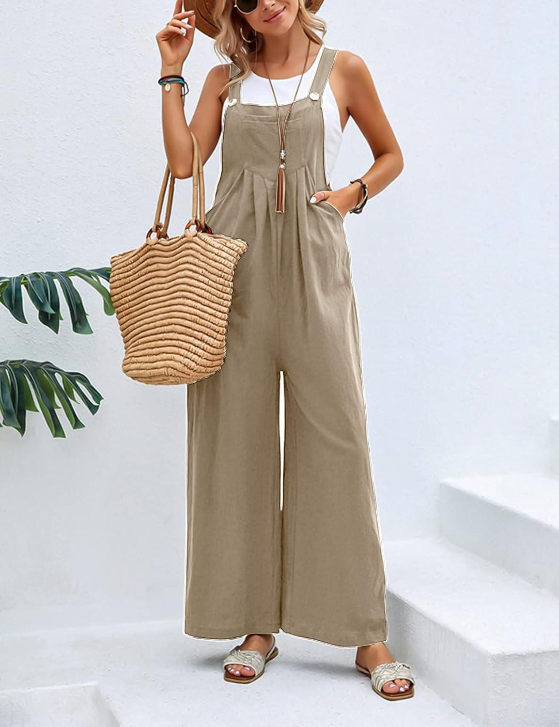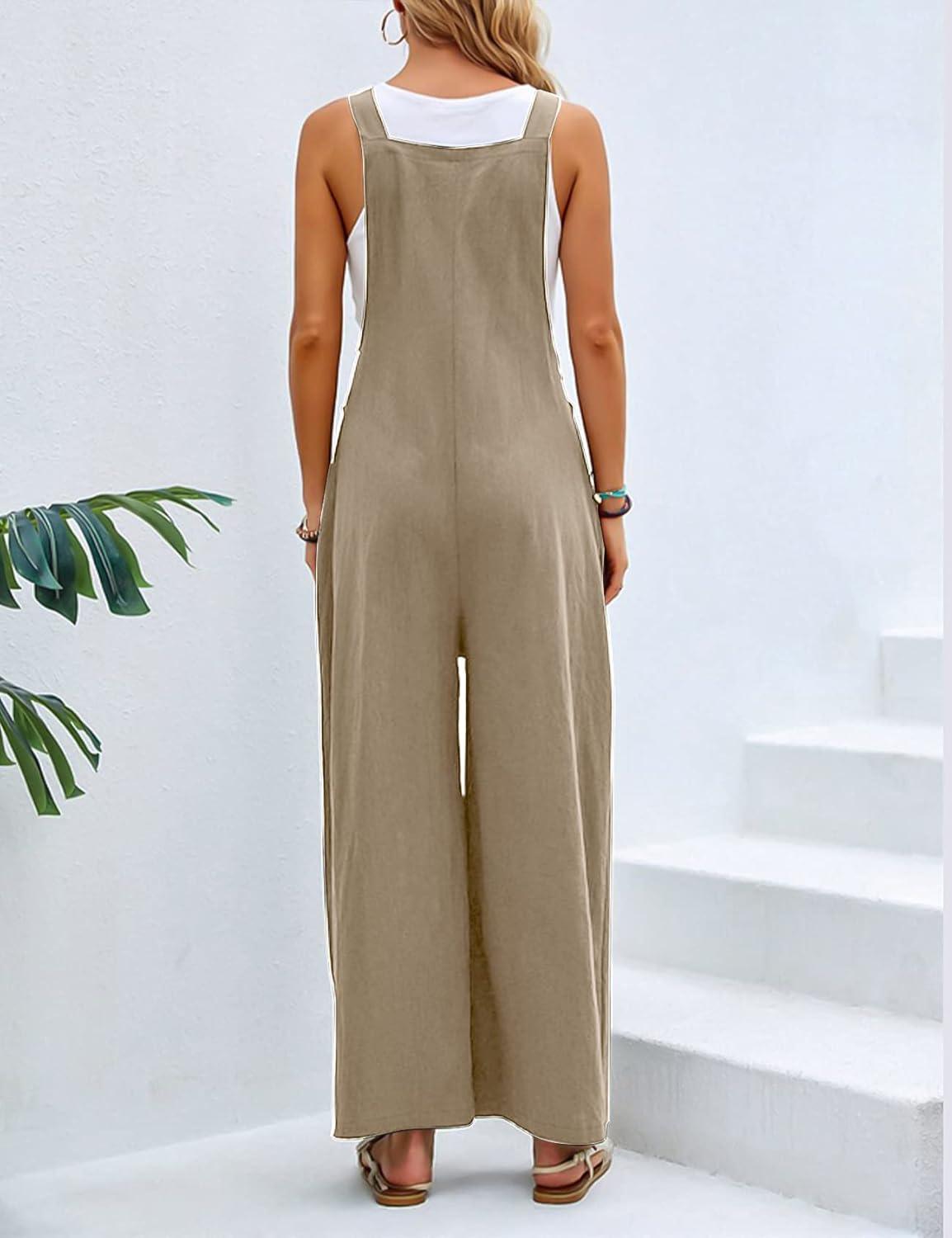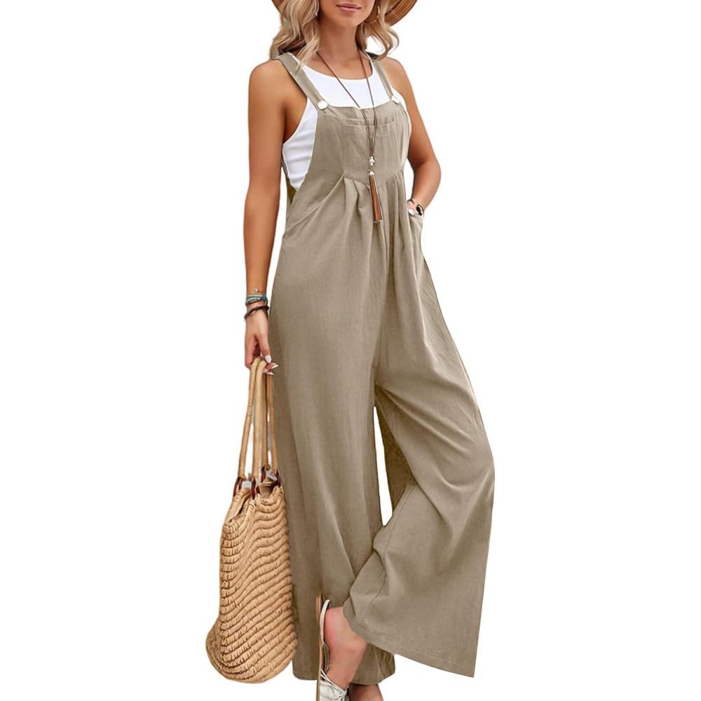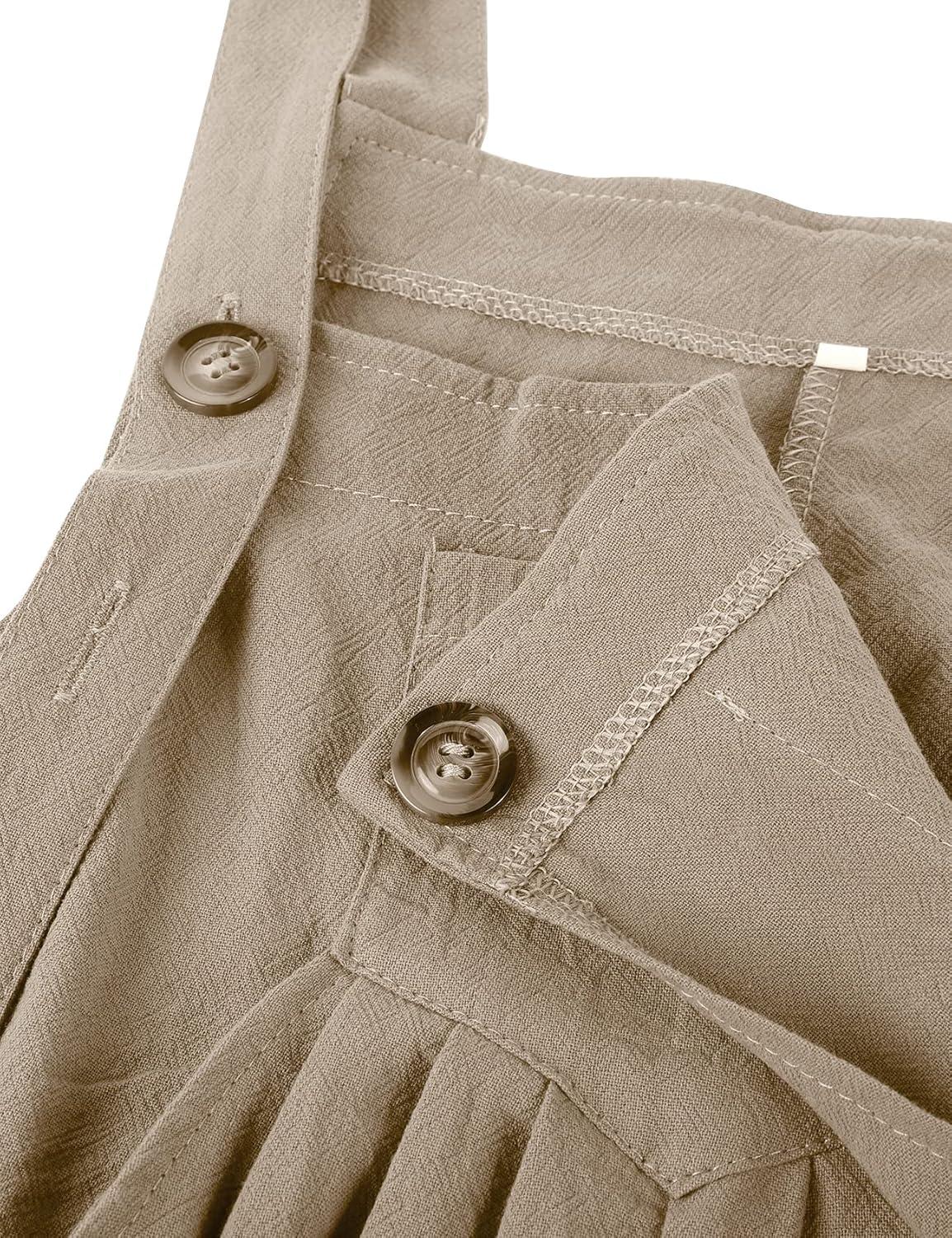 Flygo Womens Overalls Loose Fit Cotton Linen Bib Overall Wide Leg Jumpsuit Rompers with Pockets(Khaki)