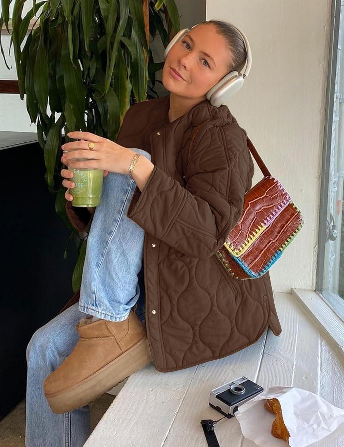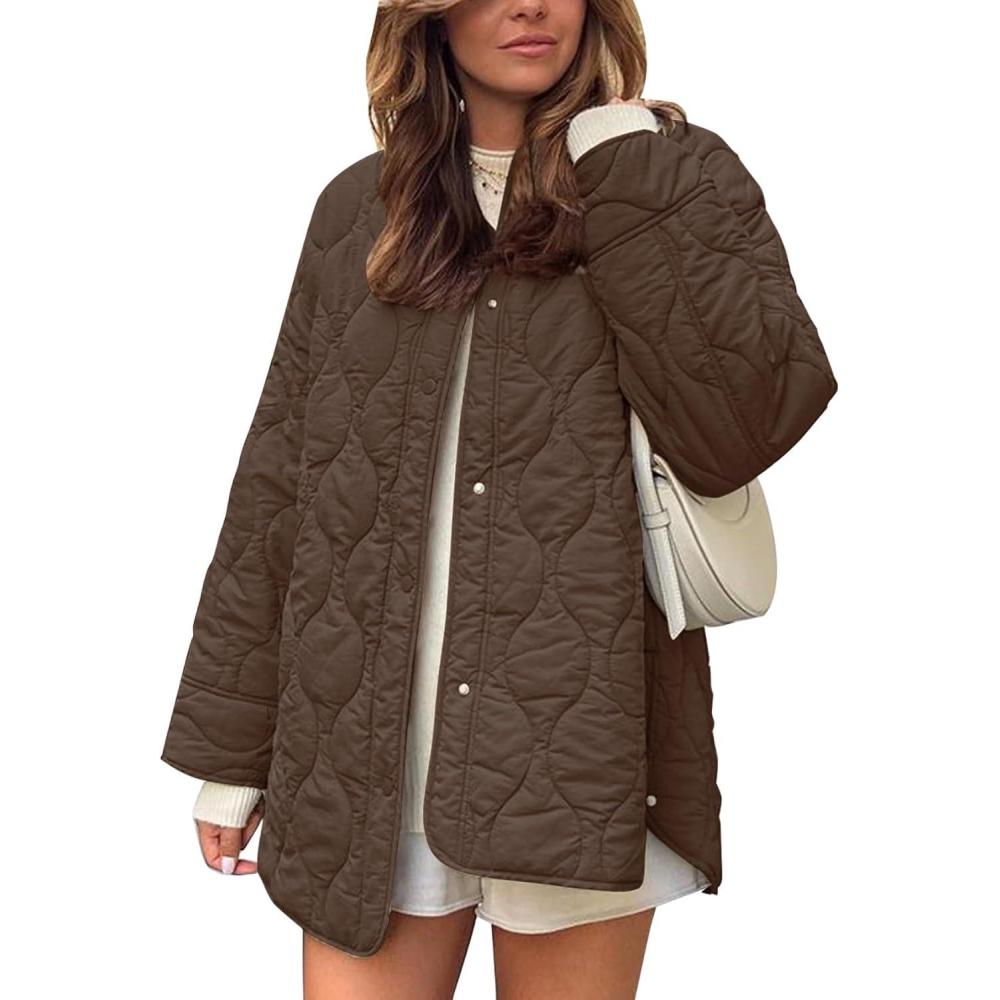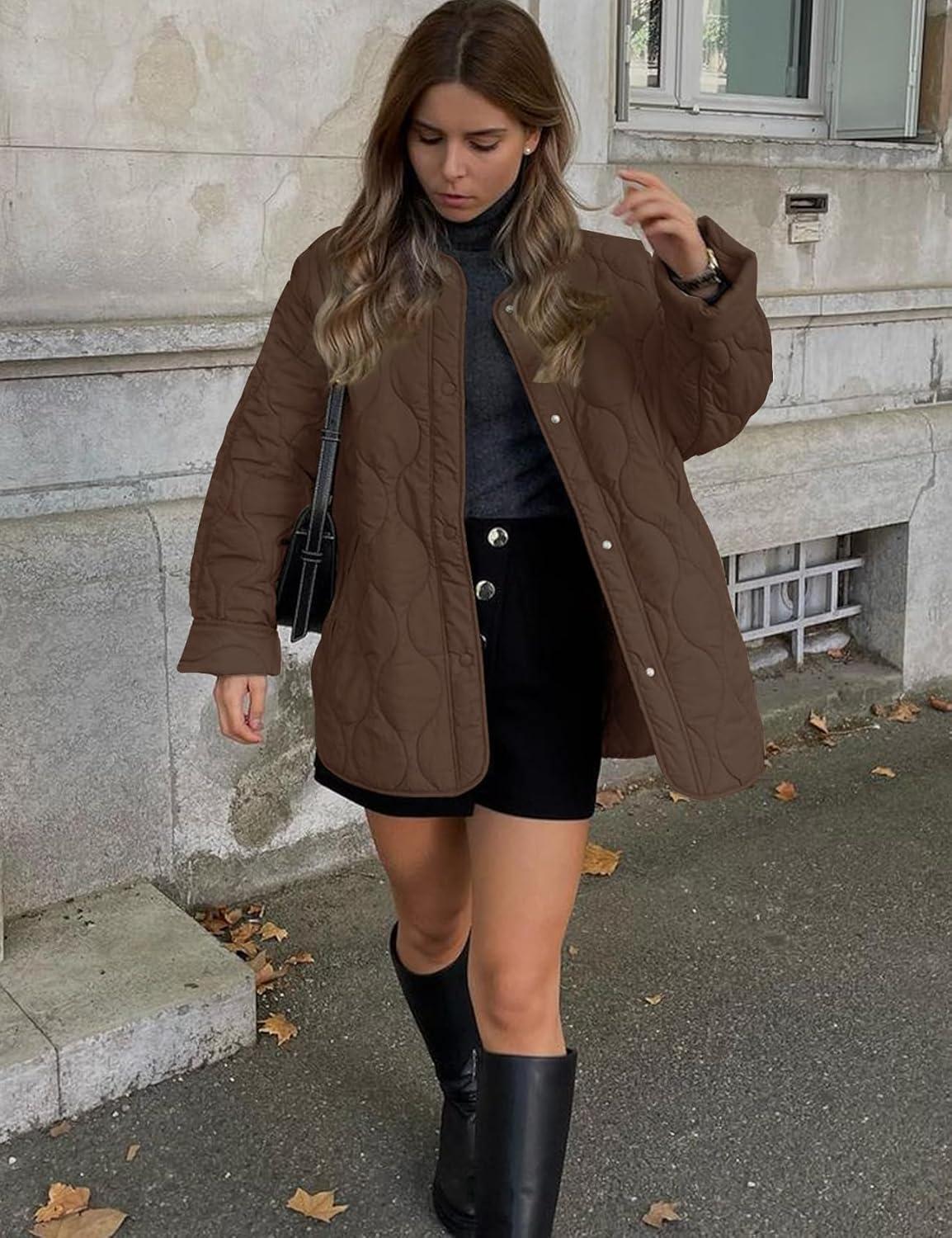 Flygo Women’s Oversized Quilted Lightweight Jacket Button Down Puffer Padded Outerwear with Pocket(Coffee)