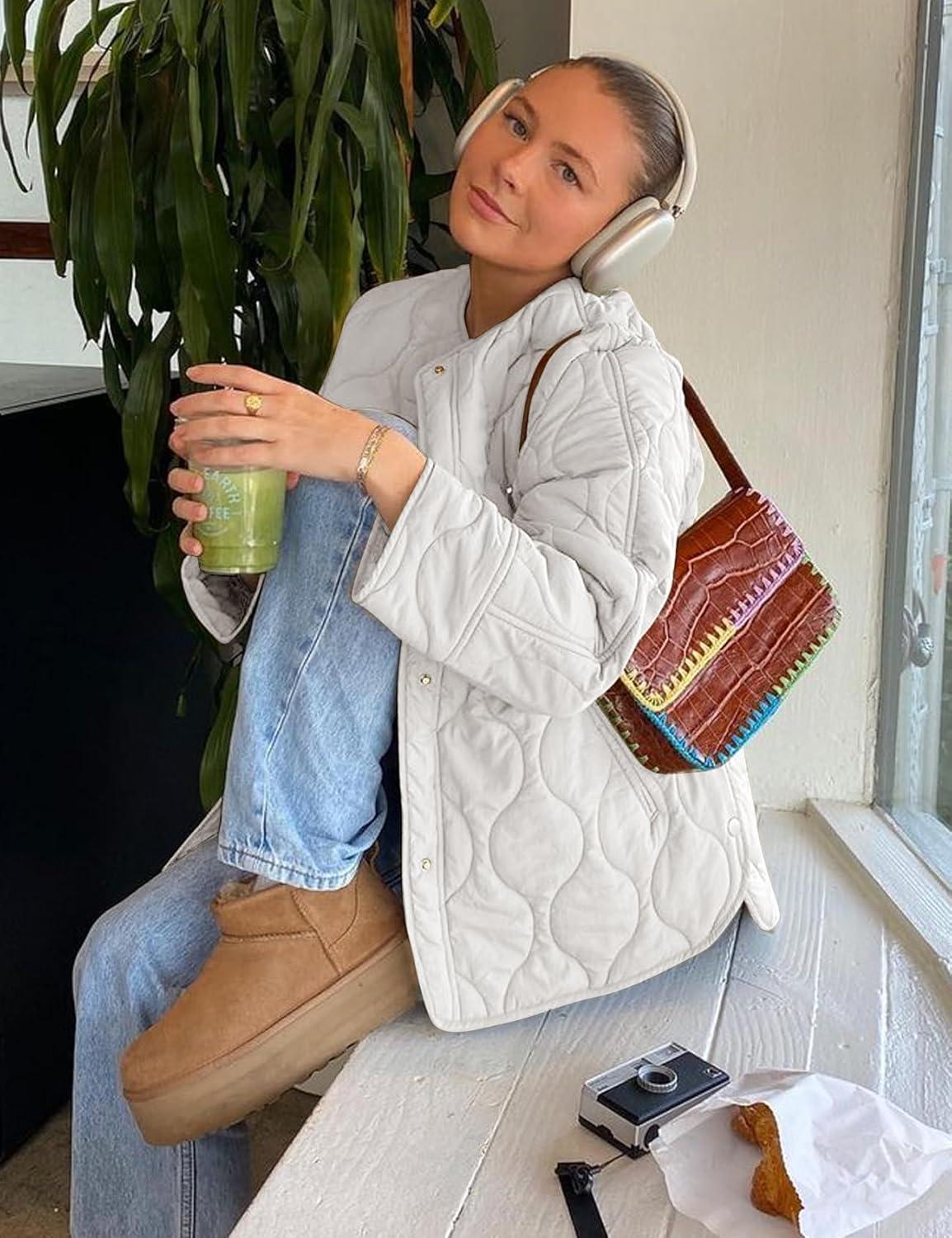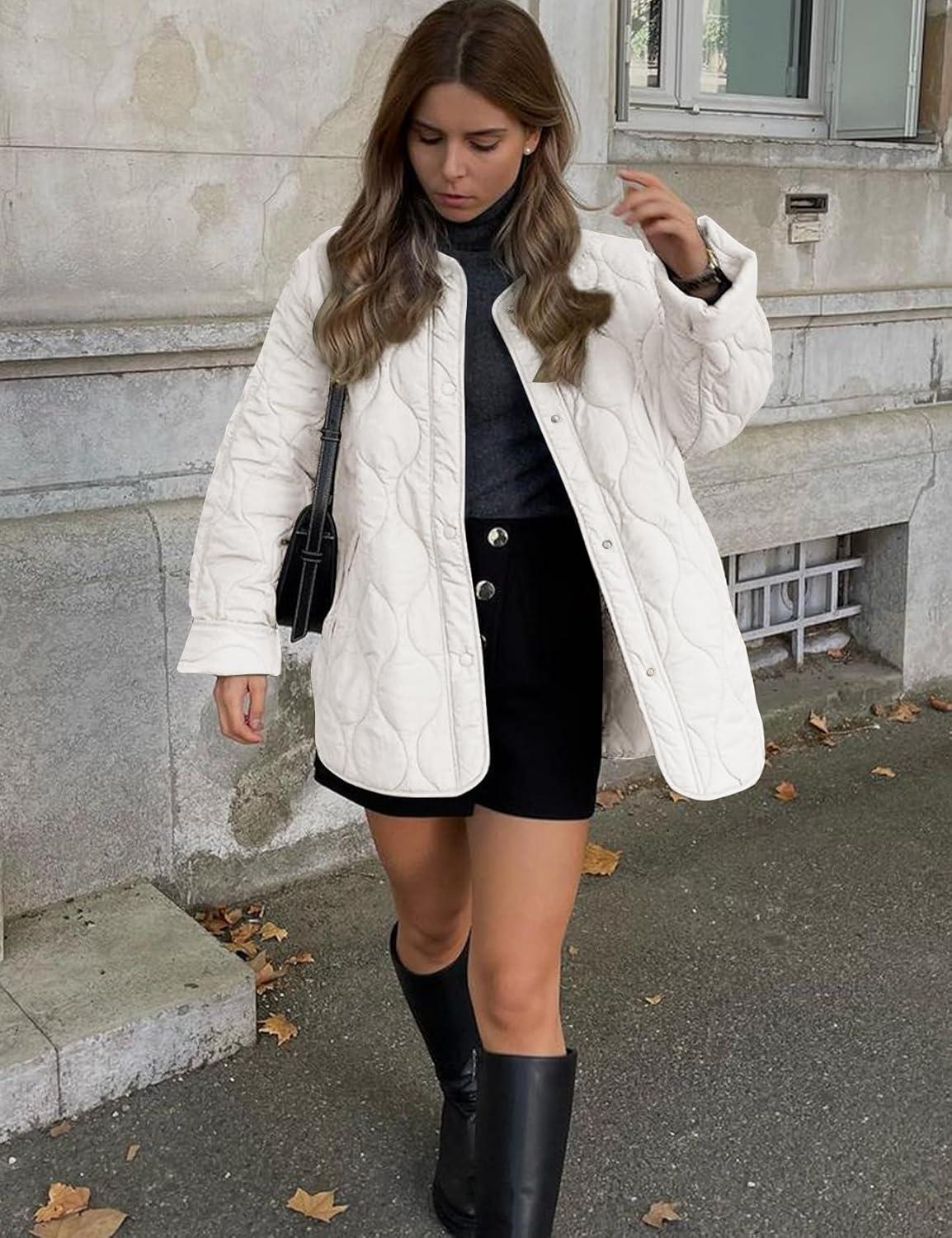 Flygo Women’s Oversized Quilted Lightweight Jacket Button Down Puffer Padded Outerwear with Pocket(White)