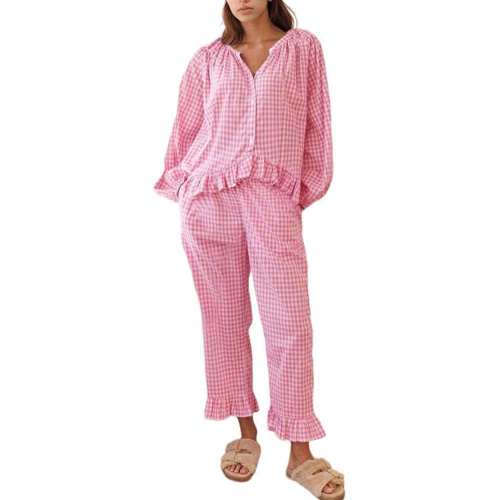 Flygo Womens Plaid Pajamas Sets 2 Piece Cotton Pj Set Puff Sleeve Ruffle Babydoll Shirt Gingham Pants Lounge Sets(Pink)