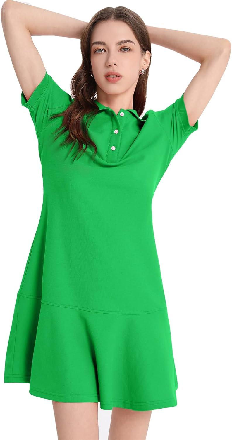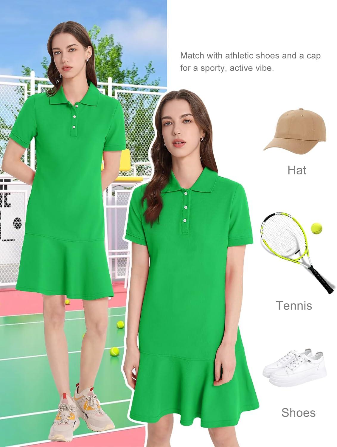 Flygo Womens Polo Dress Collared Short Sleeve Ruffle Golf Tennis T Shirt Sports Workout Mini Summer Dresses Tunic Pique(Green)