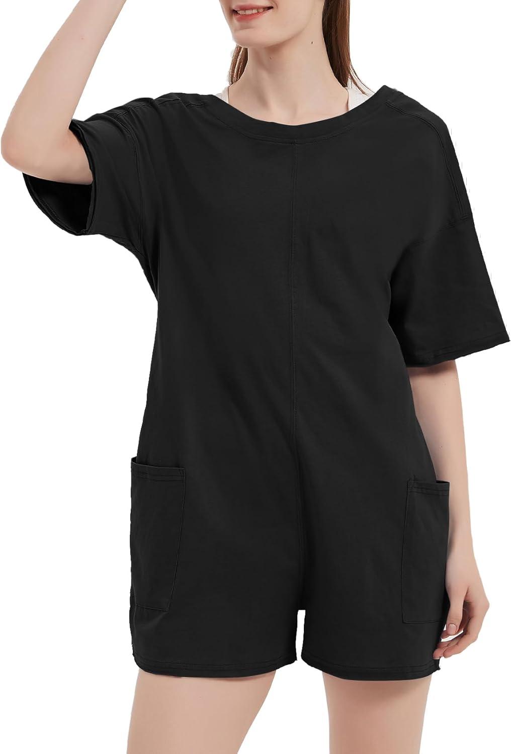 Flygo Women’s Romper Short Sleeve Tee Rompers Crewneck Jumpsuit Back V Neck Casual Hot Shot One Piece Outfits with Pockets(Black)