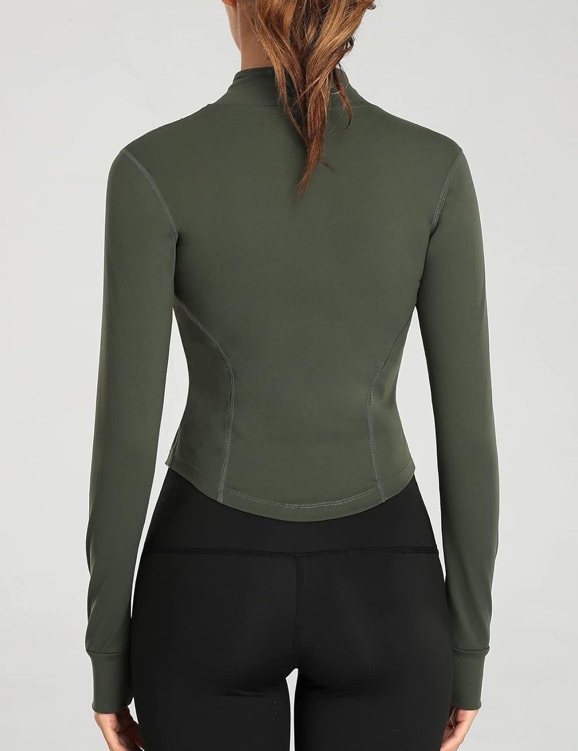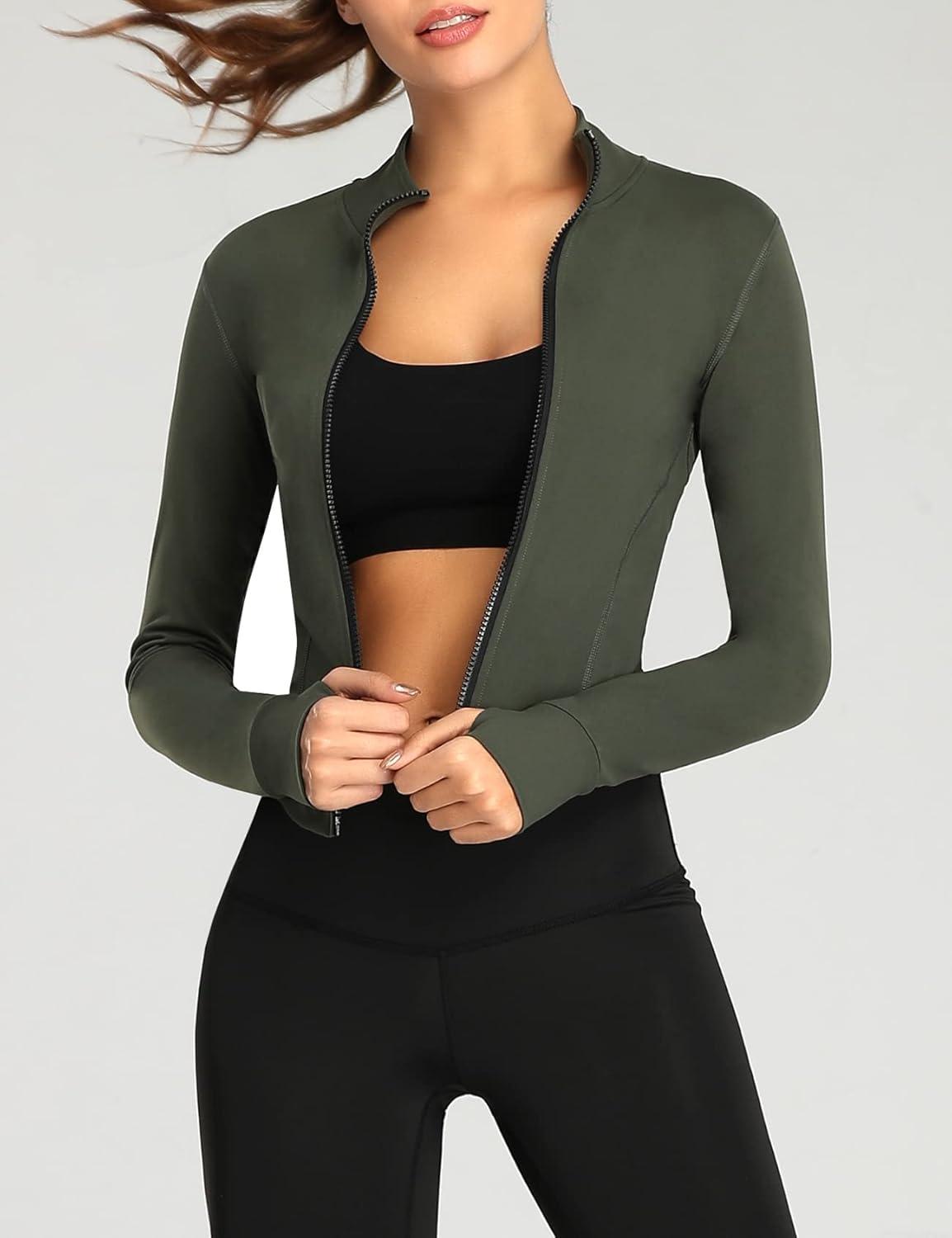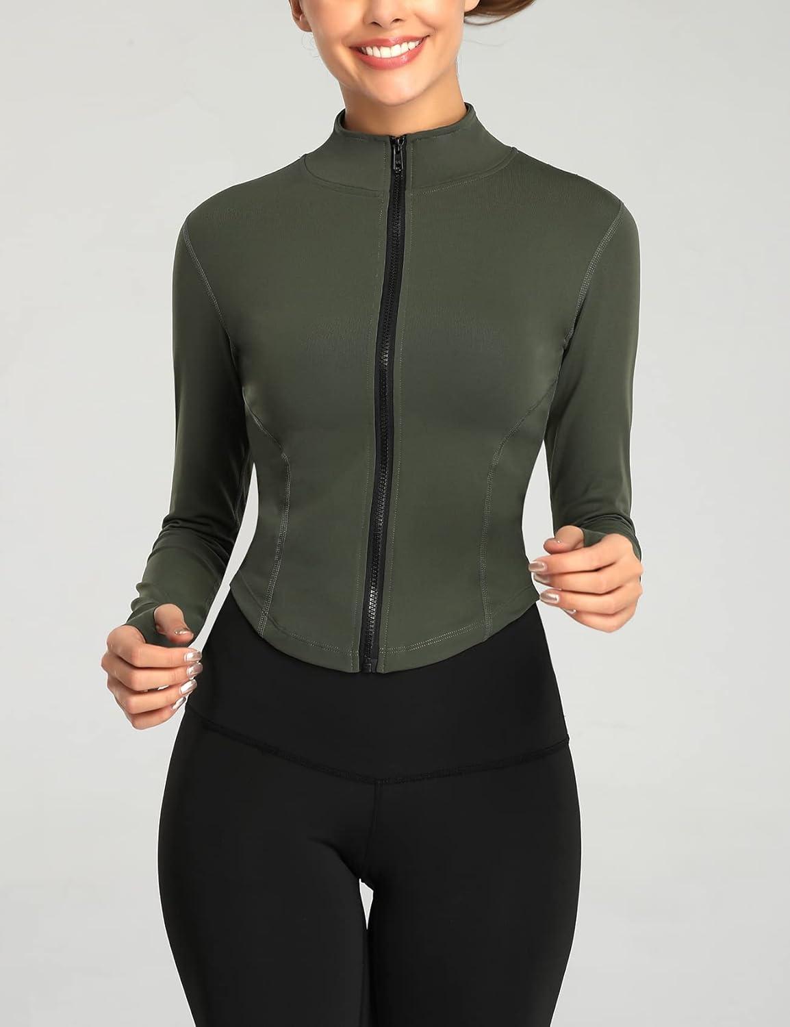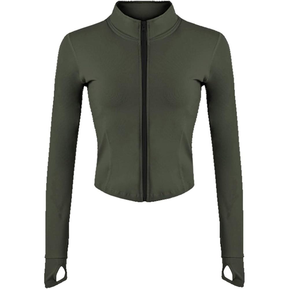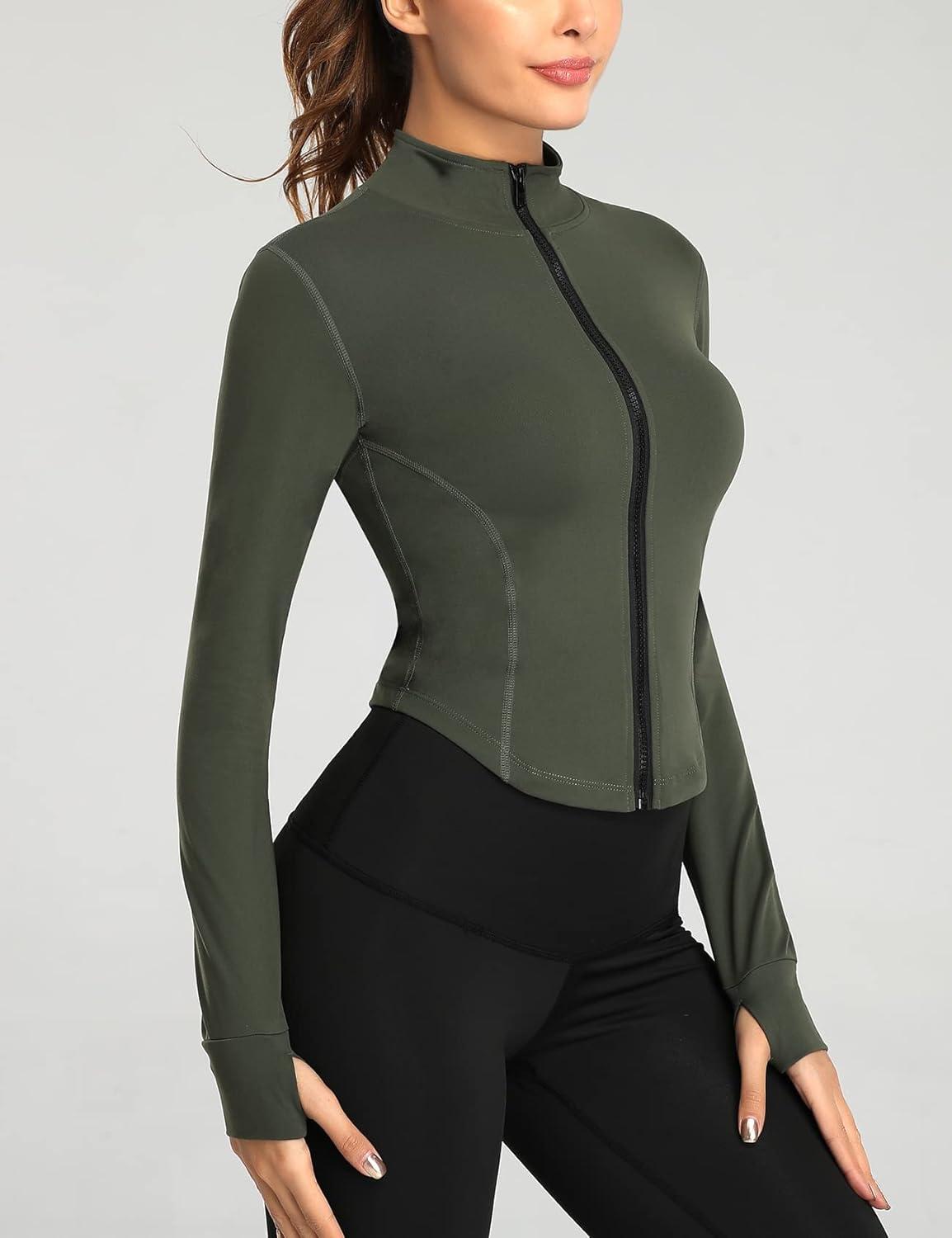 Flygo Women’s Seamless Slim Full Zip Workout Track Yoga Jacket with Thumb Hole(Armygreen)