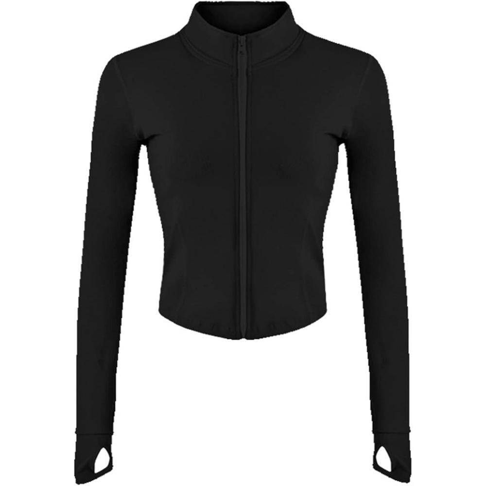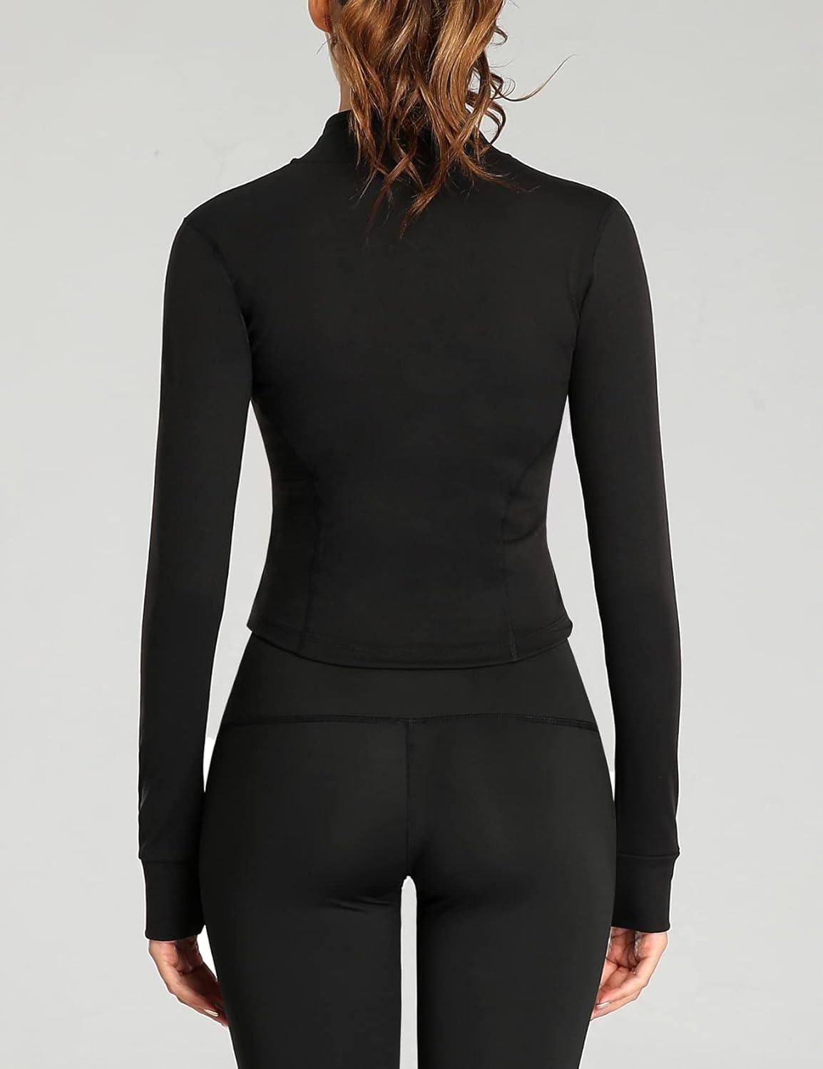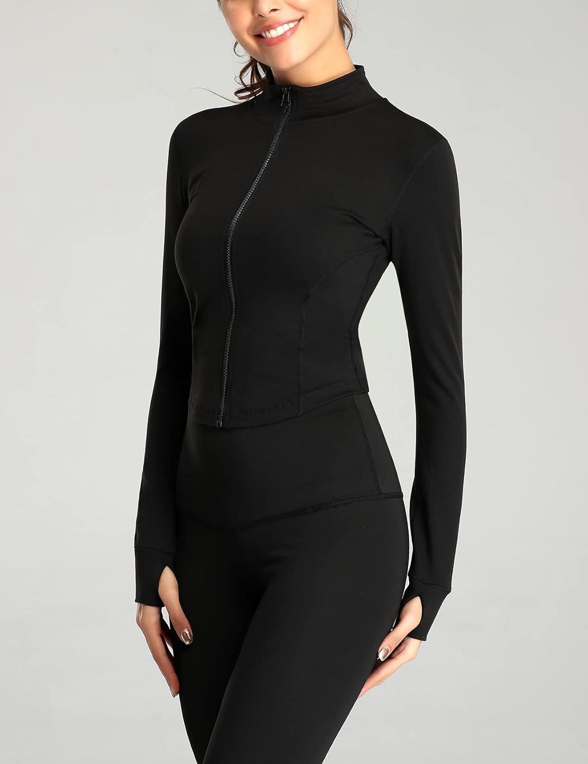 Flygo Women’s Seamless Slim Full Zip Workout Track Yoga Jacket with Thumb Hole(Black)