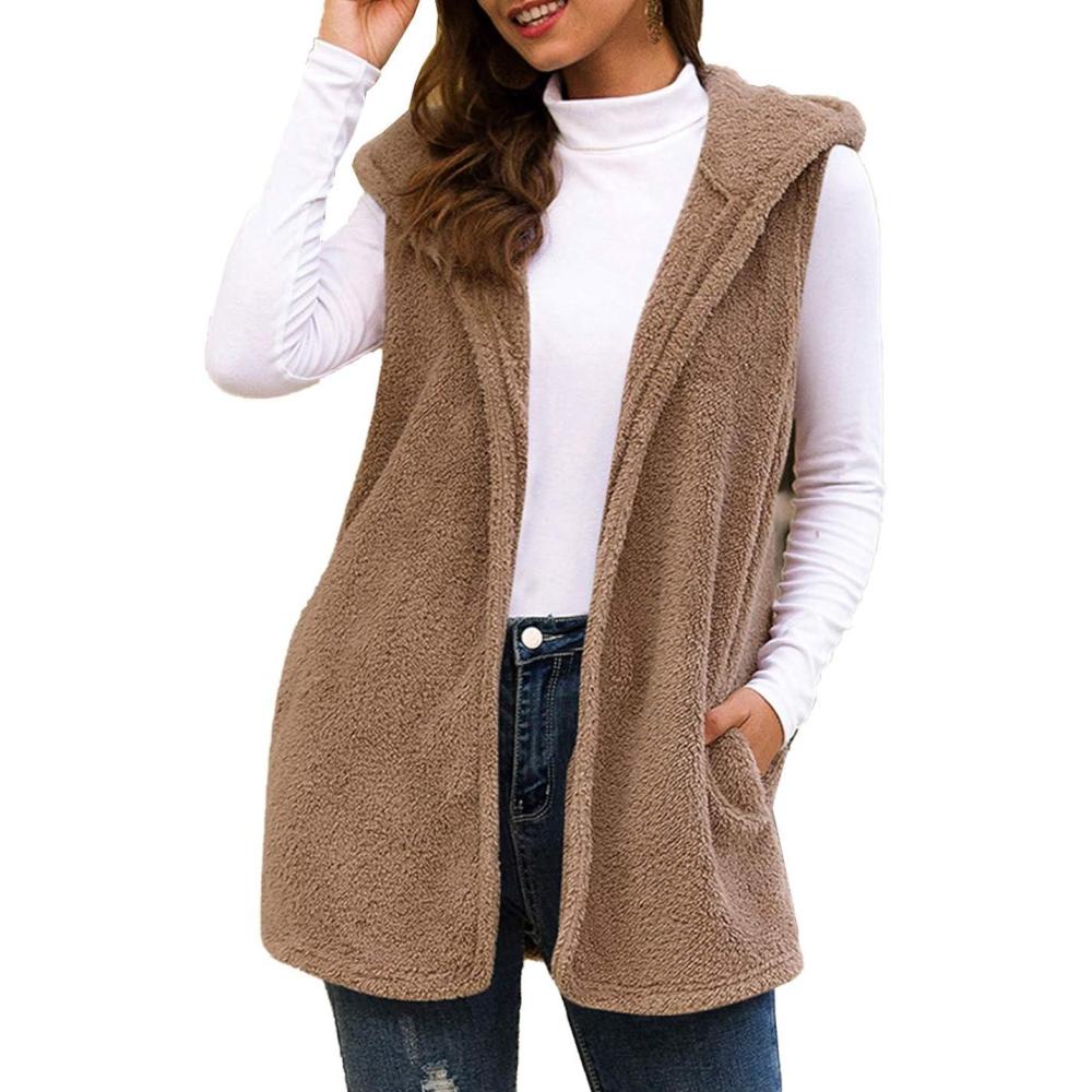 Flygo Women’s Sleeveless Sherpa Vest Open Front Hooded Fleece Jackets Hooded Coat Cardigan with Pockets(Khaki)