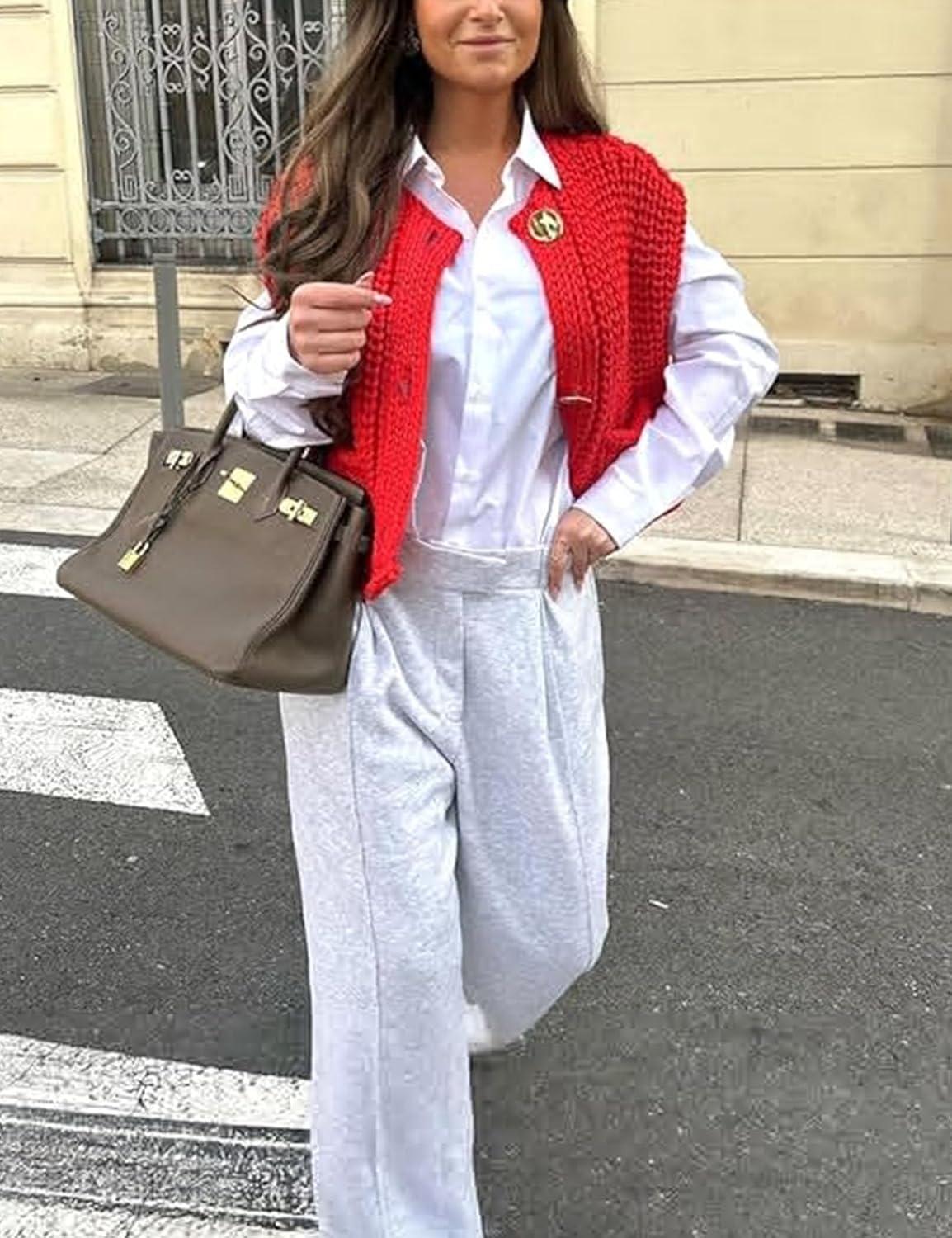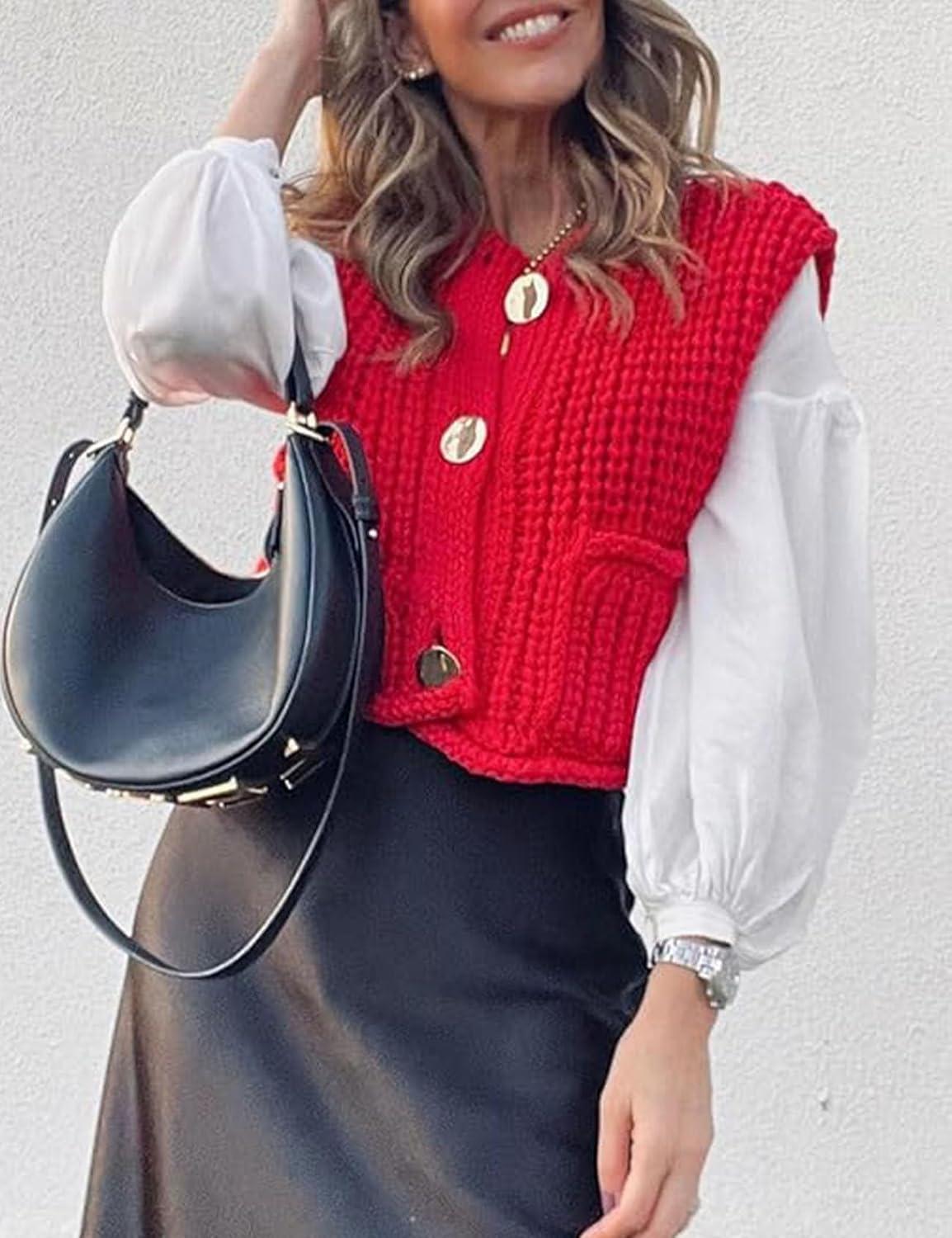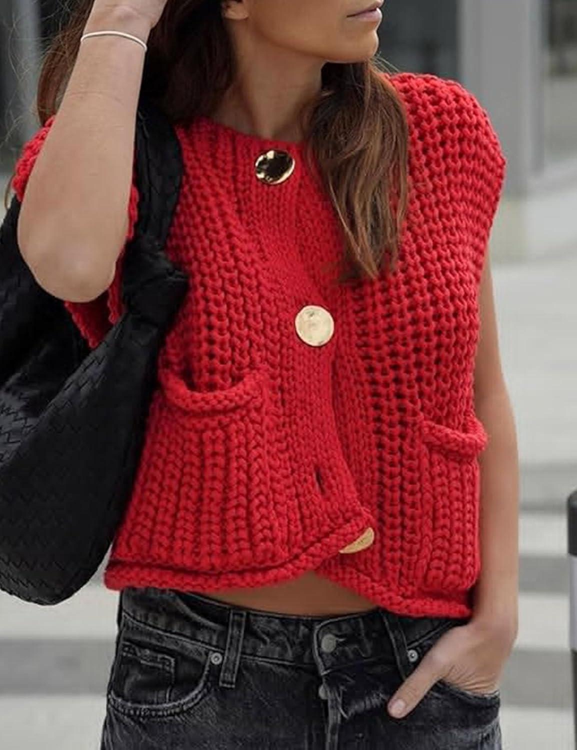 Flygo Womens Sleeveless Sweater Vest 2025 Fall Sweaters Crop Knit Top Chunky Crochet Button Cardigan Sweaters(Red)