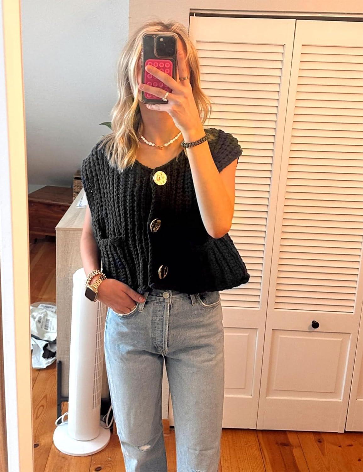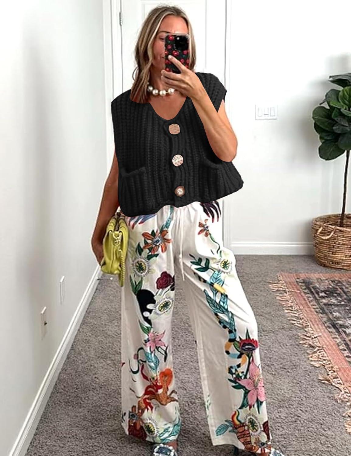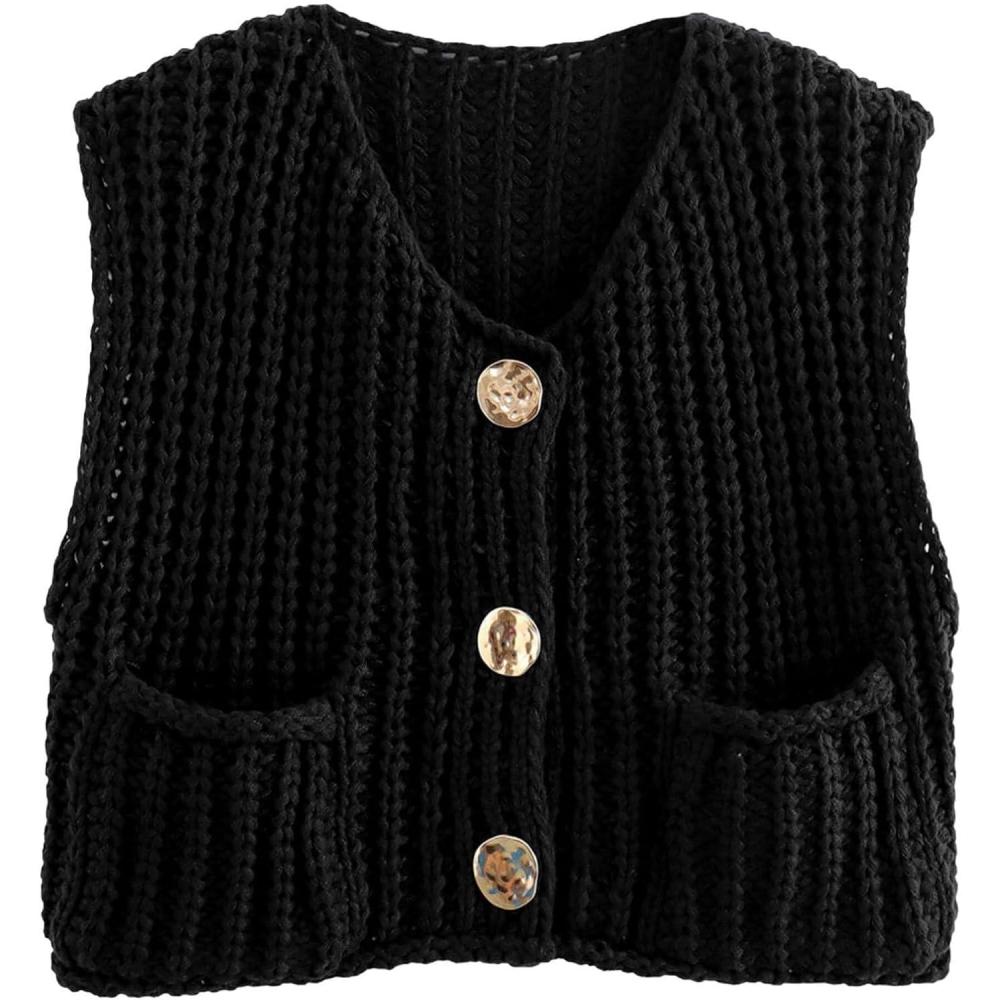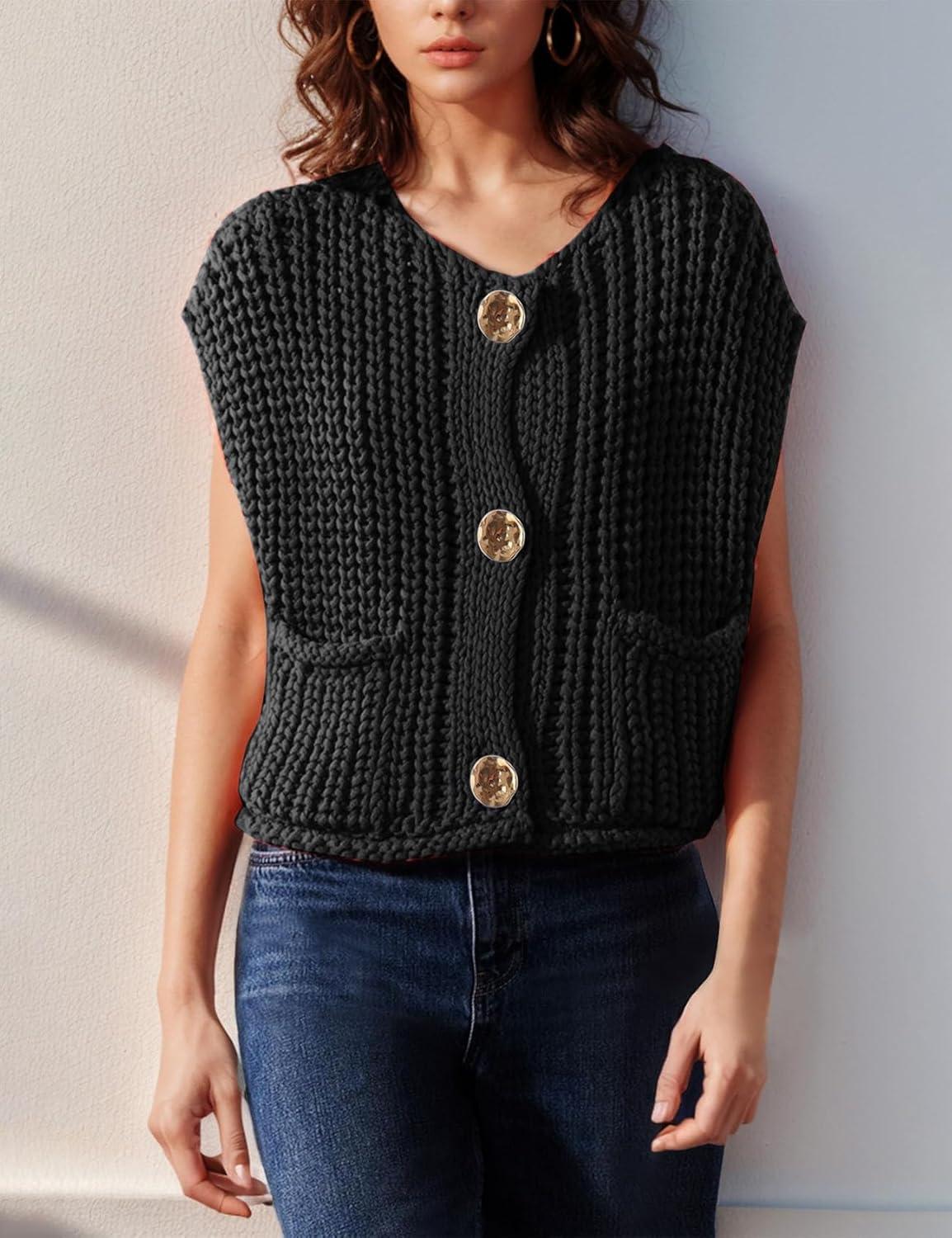 Flygo Womens Sleeveless Sweater Vest 2025 Fall Sweaters Loose Crop Knit Top Chunky Crochet Button Cardigan Sweaters(Black)