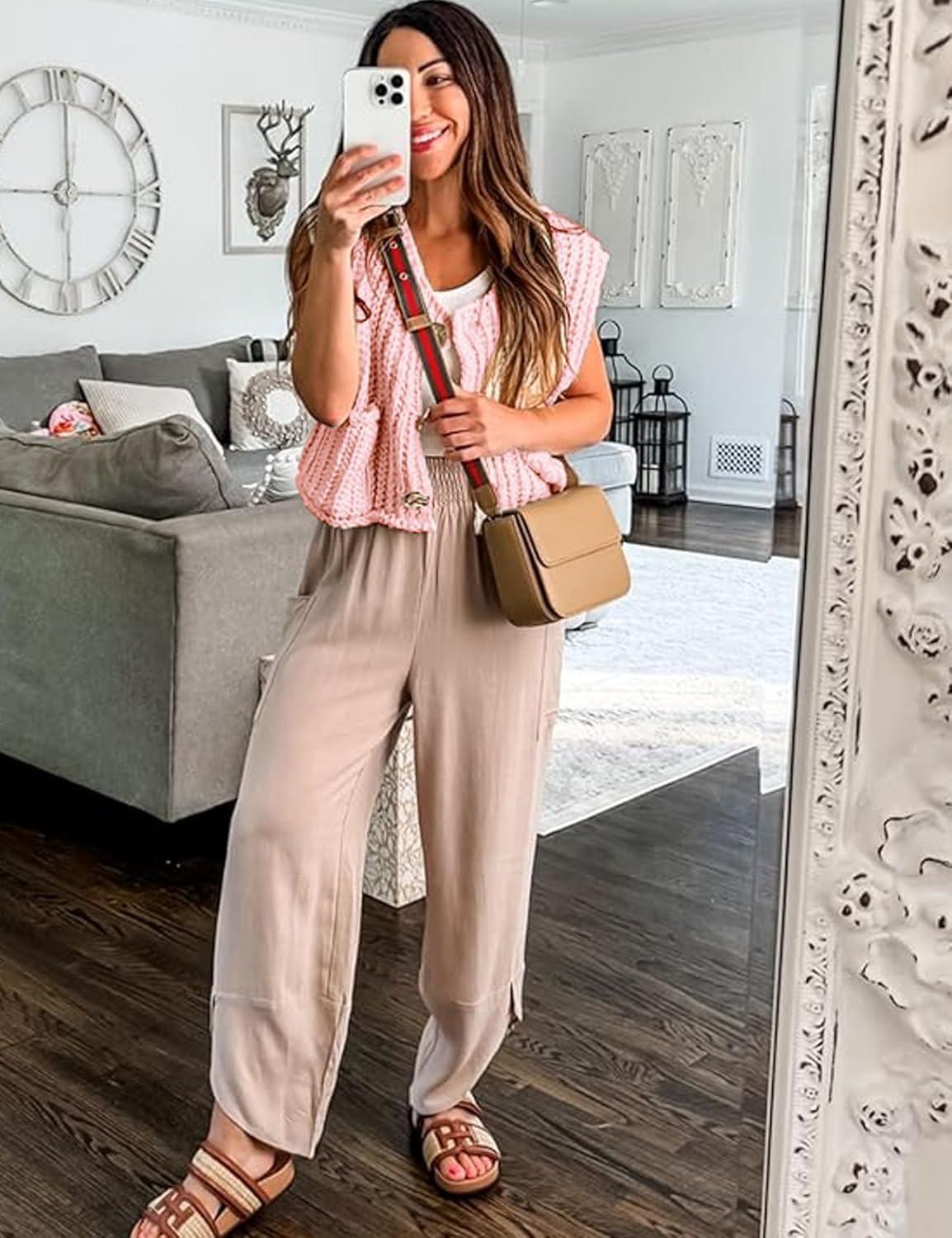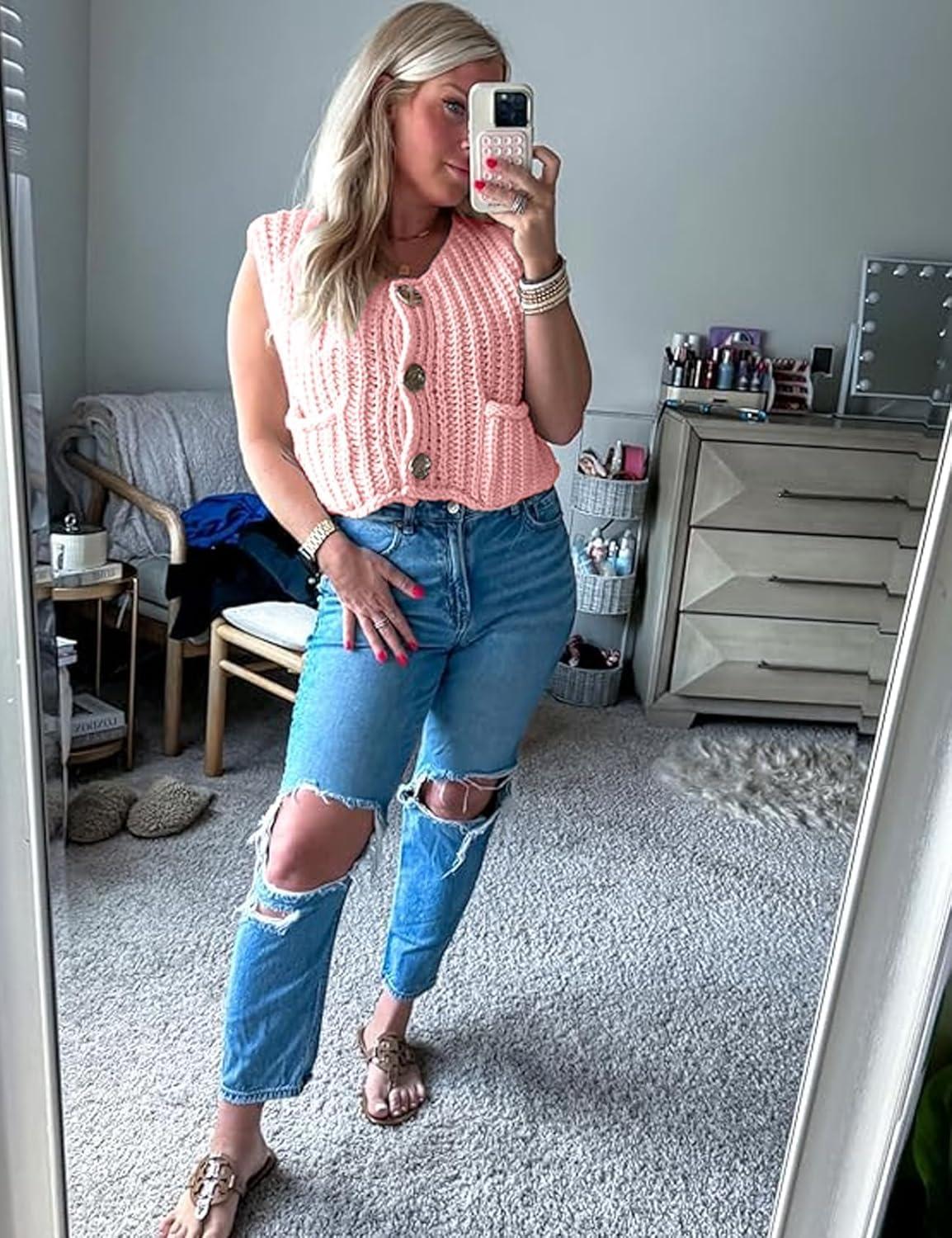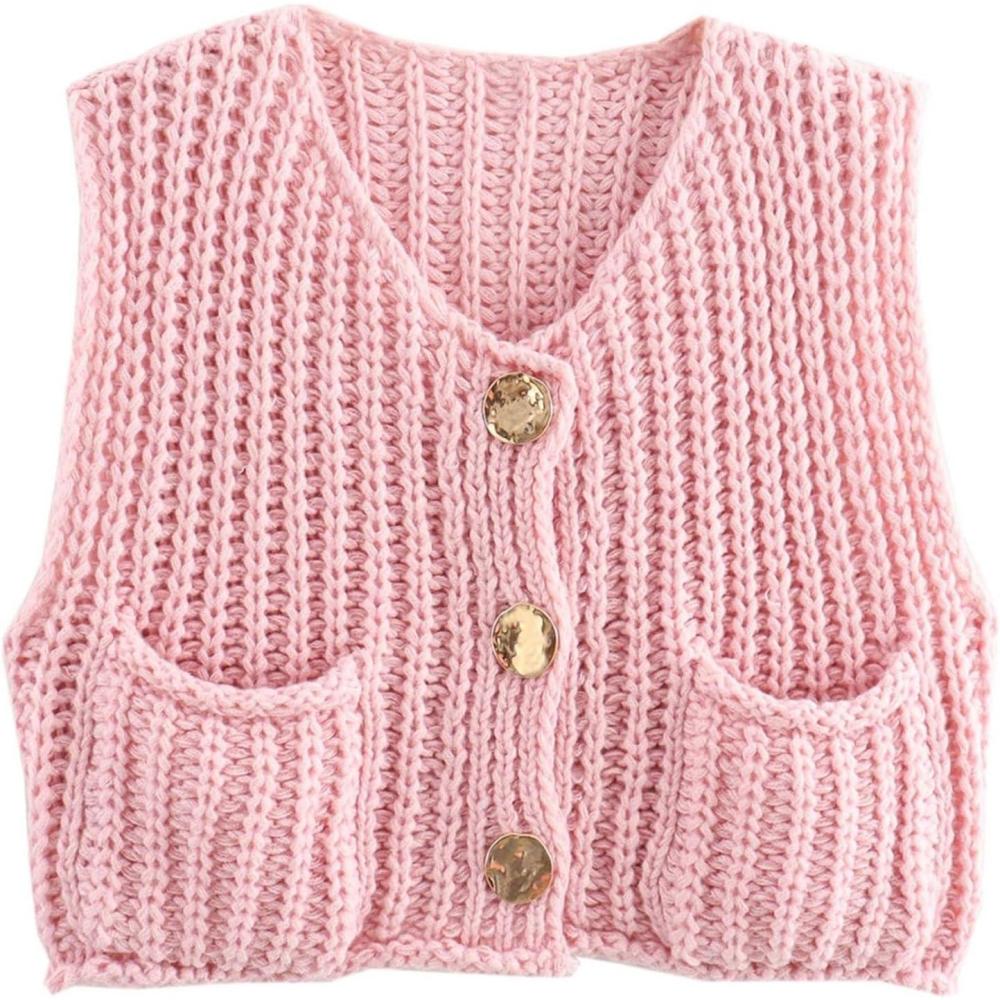Flygo Womens Sleeveless Sweater Vest 2025 Fall Sweaters Loose Crop Knit Top Chunky Crochet Button Cardigan Sweaters(Pink)