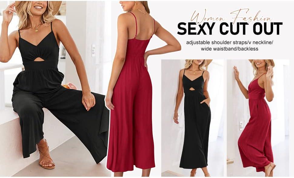 Flygo Women’s Spaghetti Strap Summer Jumpsuits V Neck Cutout Smocked Wide Leg Rompers with Pockets(Red)