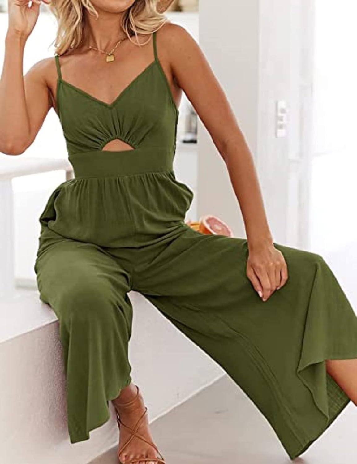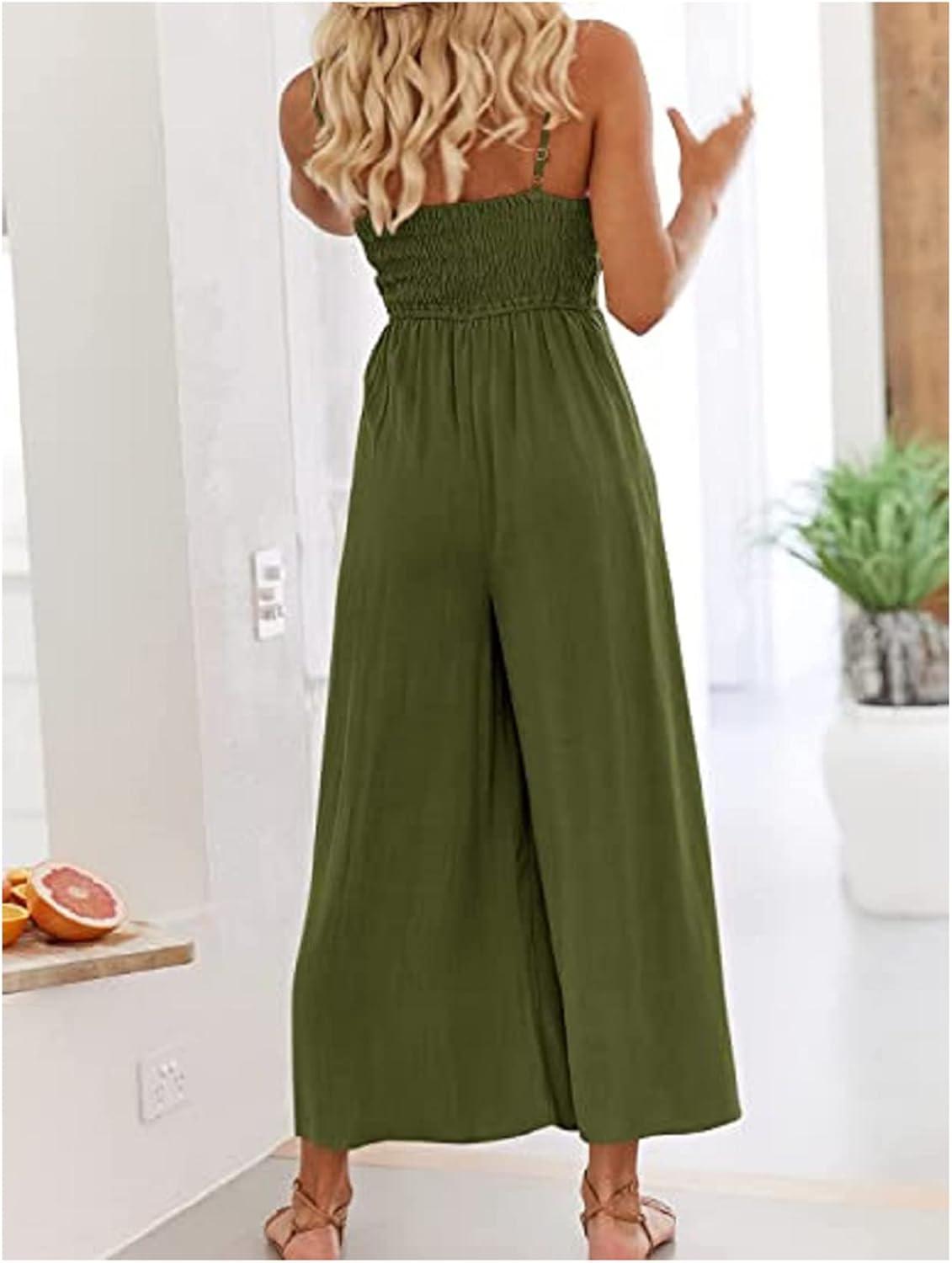 Flygo Women’s Spaghetti Strap Summer Jumpsuits V Neck Cutout Smocked Wide Leg Rompers with Pockets(Armygreen)