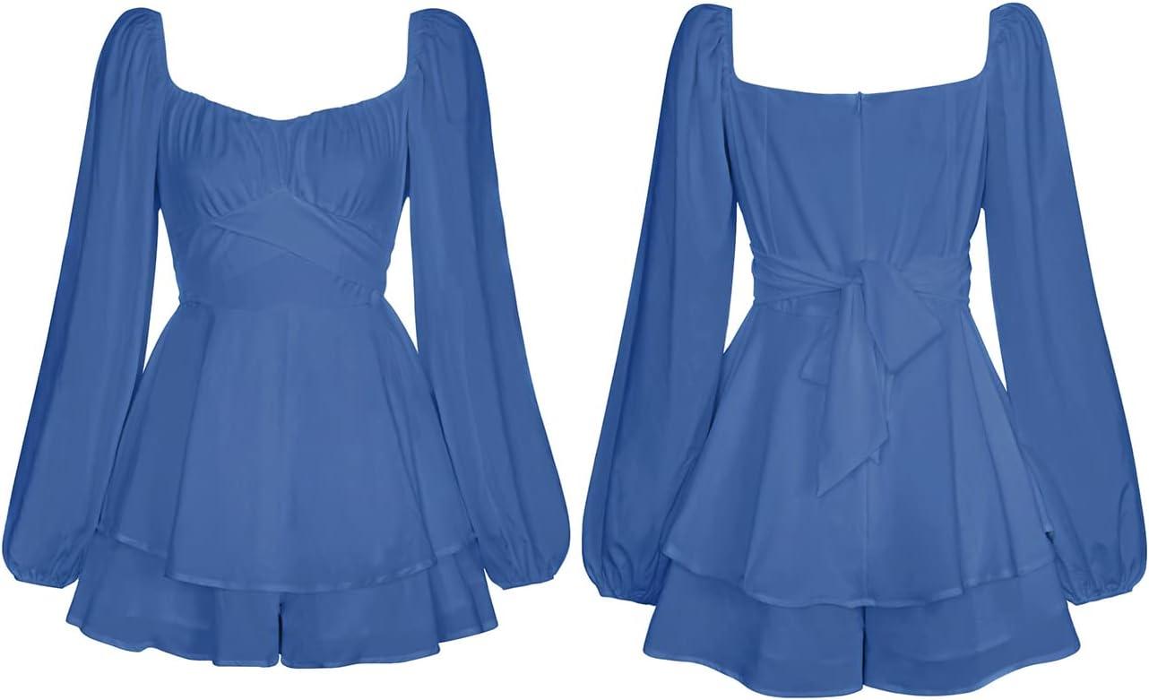 Flygo Women’s Square Neck Long Puff Sleeve Jumpsuit Tiered Ruffle Tie Back Shorts Romper(Blue)