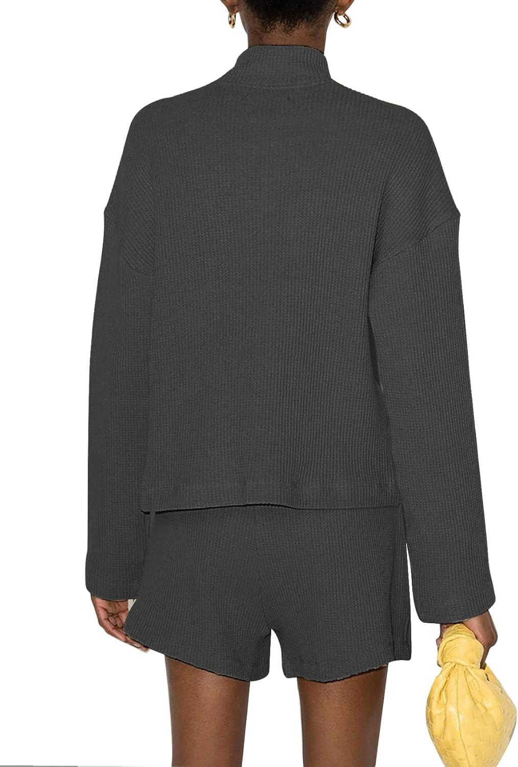 Flygo Womens Waffle Knit Pajama Set Long Sleeve Tops and Shorts Matching Lounge Set Loungewear Sweatsuit(Black)