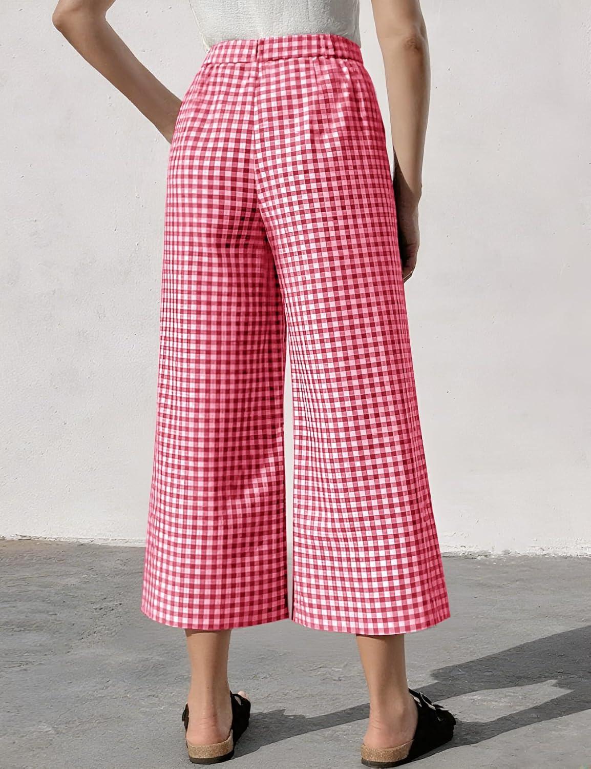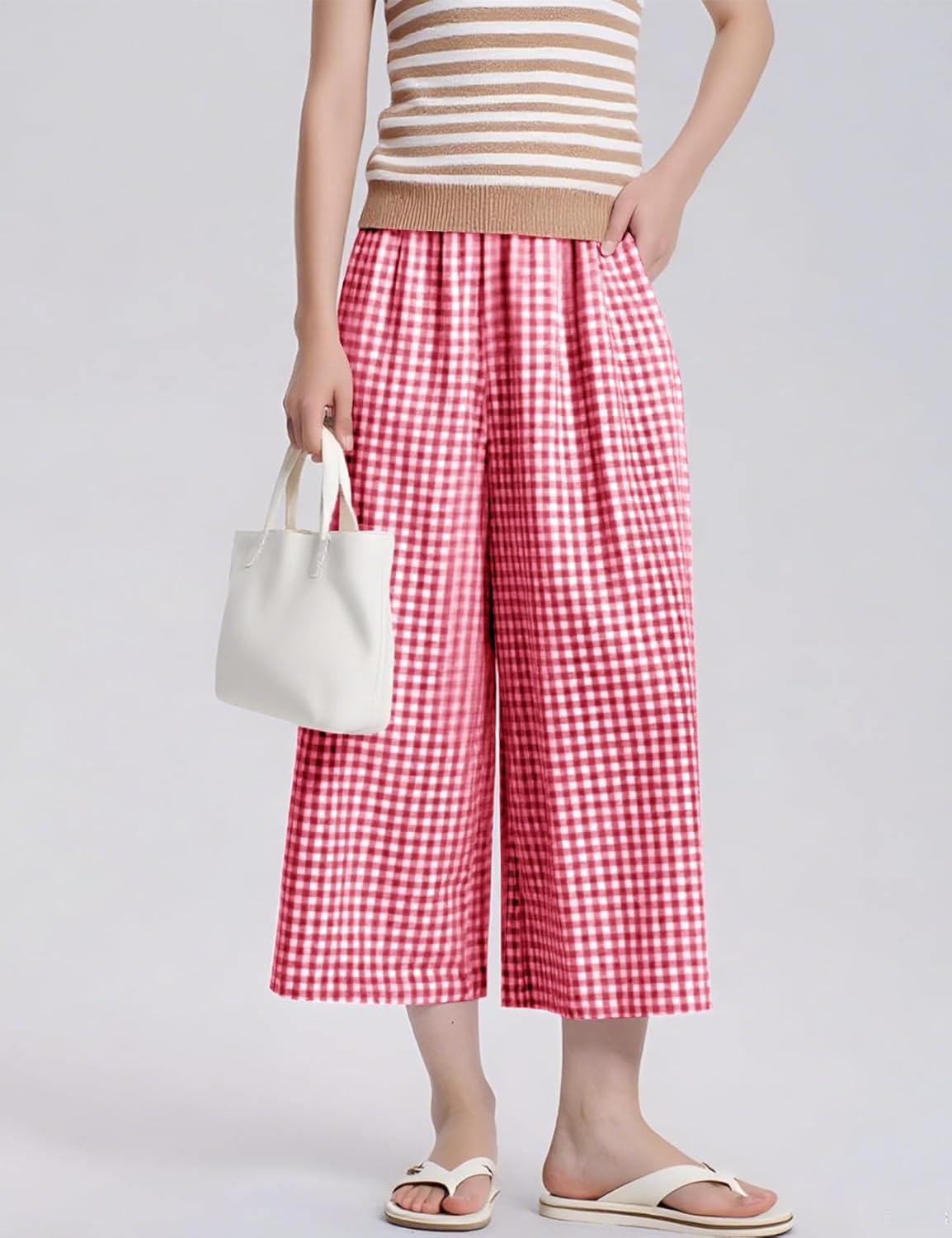 Flygo Women’s Wide Leg Gingham Capri Pants Cotton Elastic Waisted Plaid Palazzo Bottoms Flowy Trousers with Pockets(Pink)