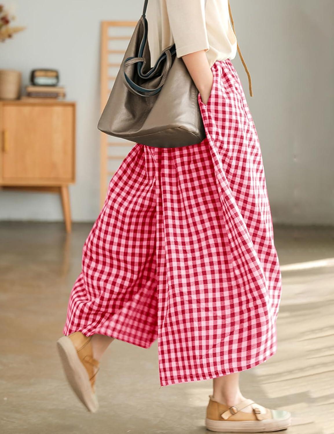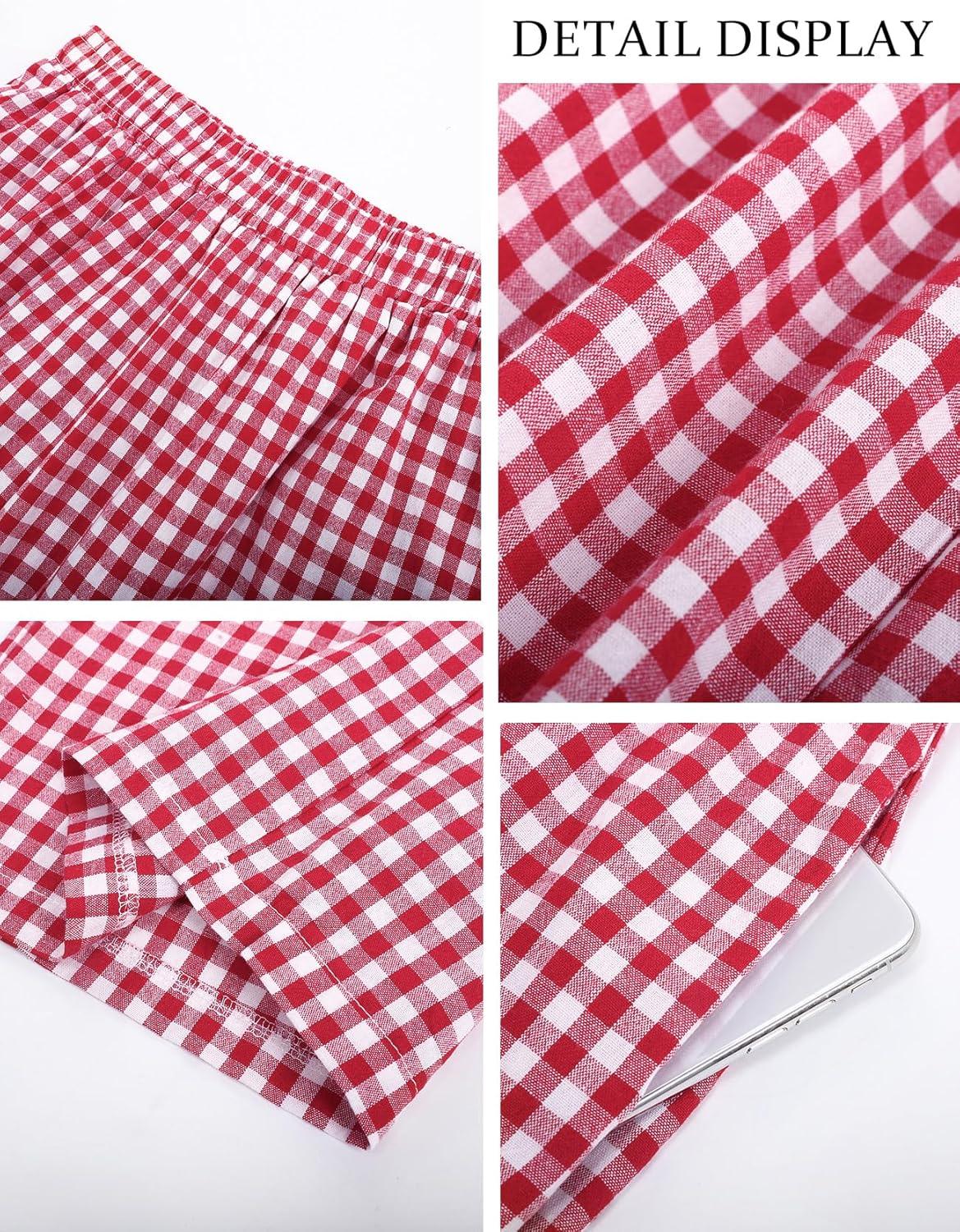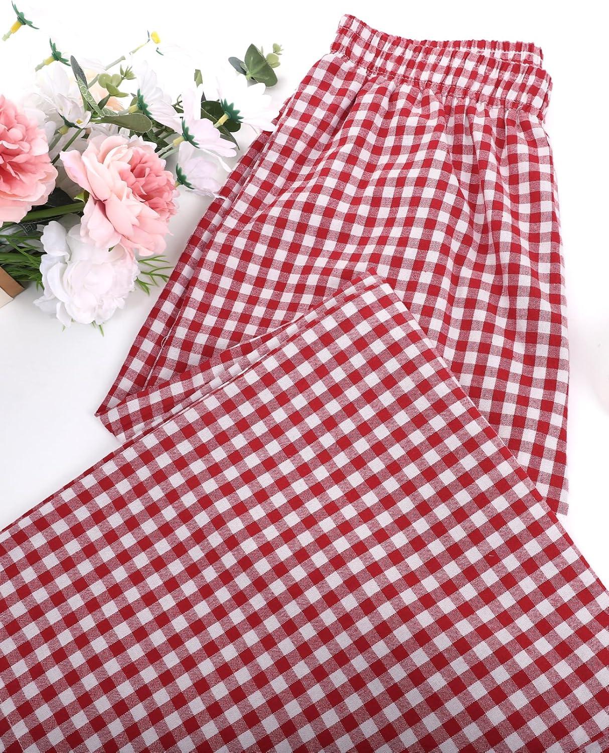 Flygo Women’s Wide Leg Gingham Capri Pants Cotton Elastic Waisted Plaid Palazzo Bottoms Flowy Trousers with Pockets(Red)