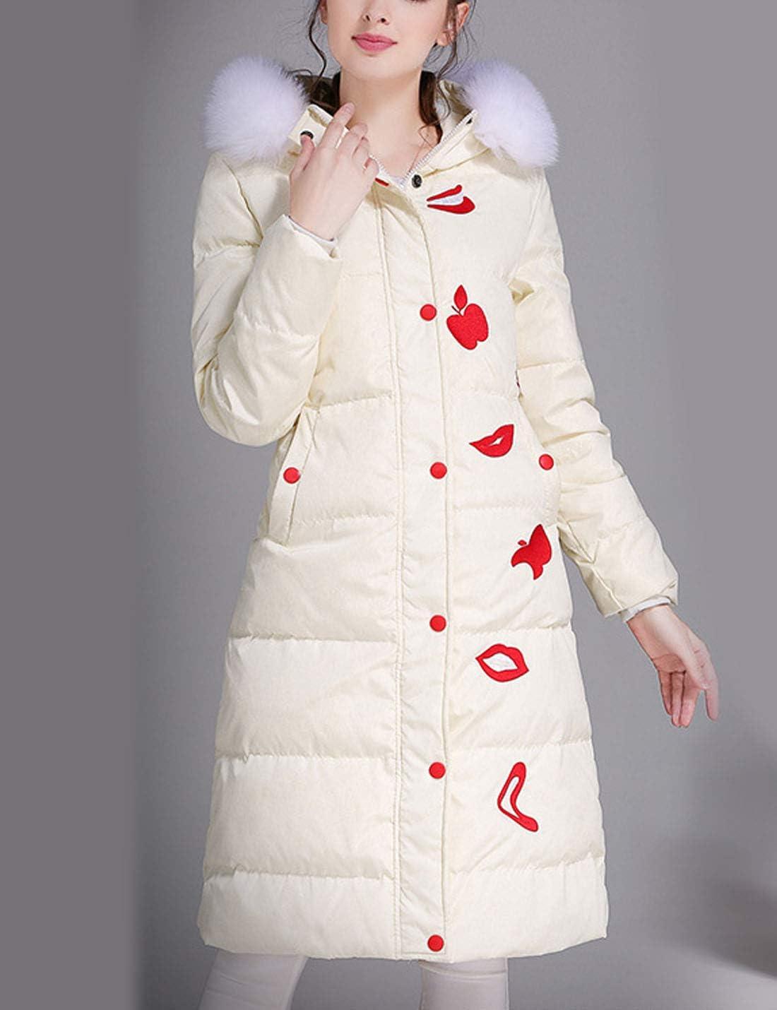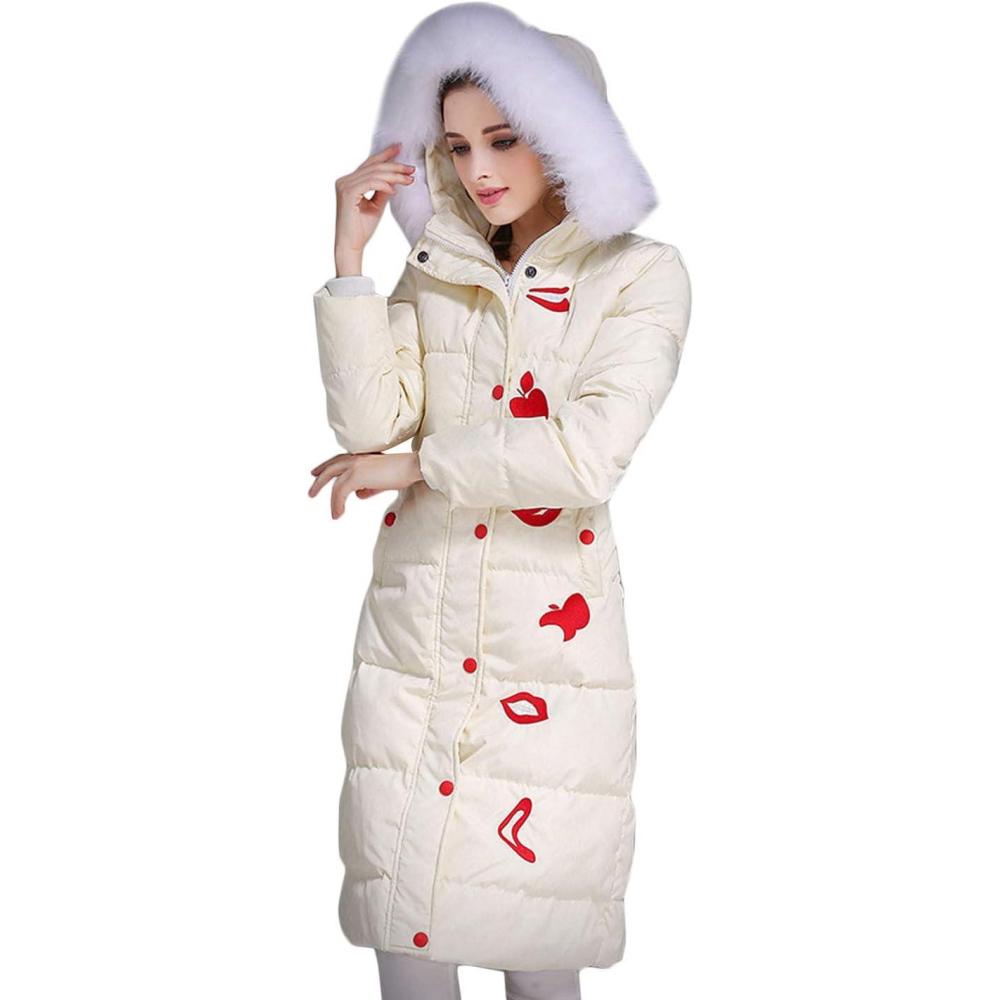 Women's long down coat with fur hood maxi full-zip button parka puffer jacket
