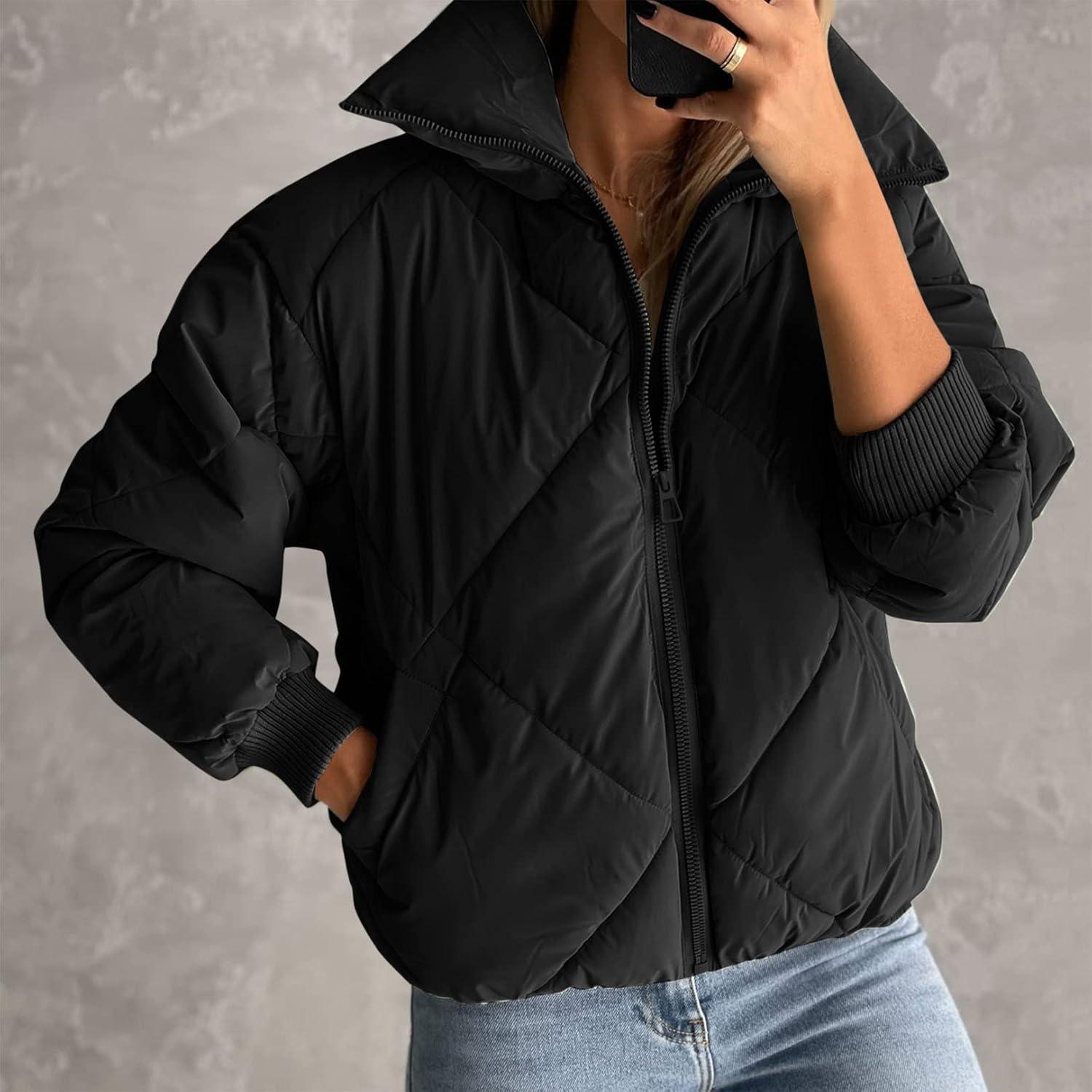 Women's long sleeve zipper puffy jacket quilted short down coat with pockets must in your wardrobe.