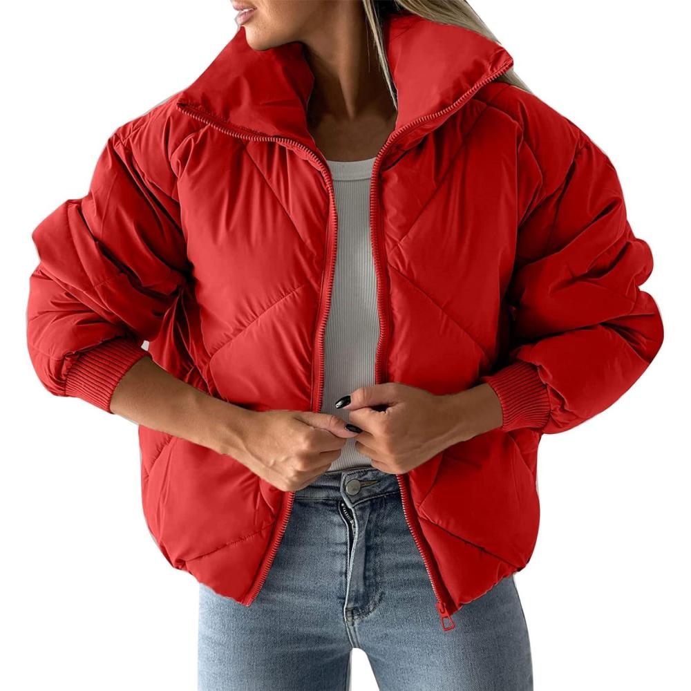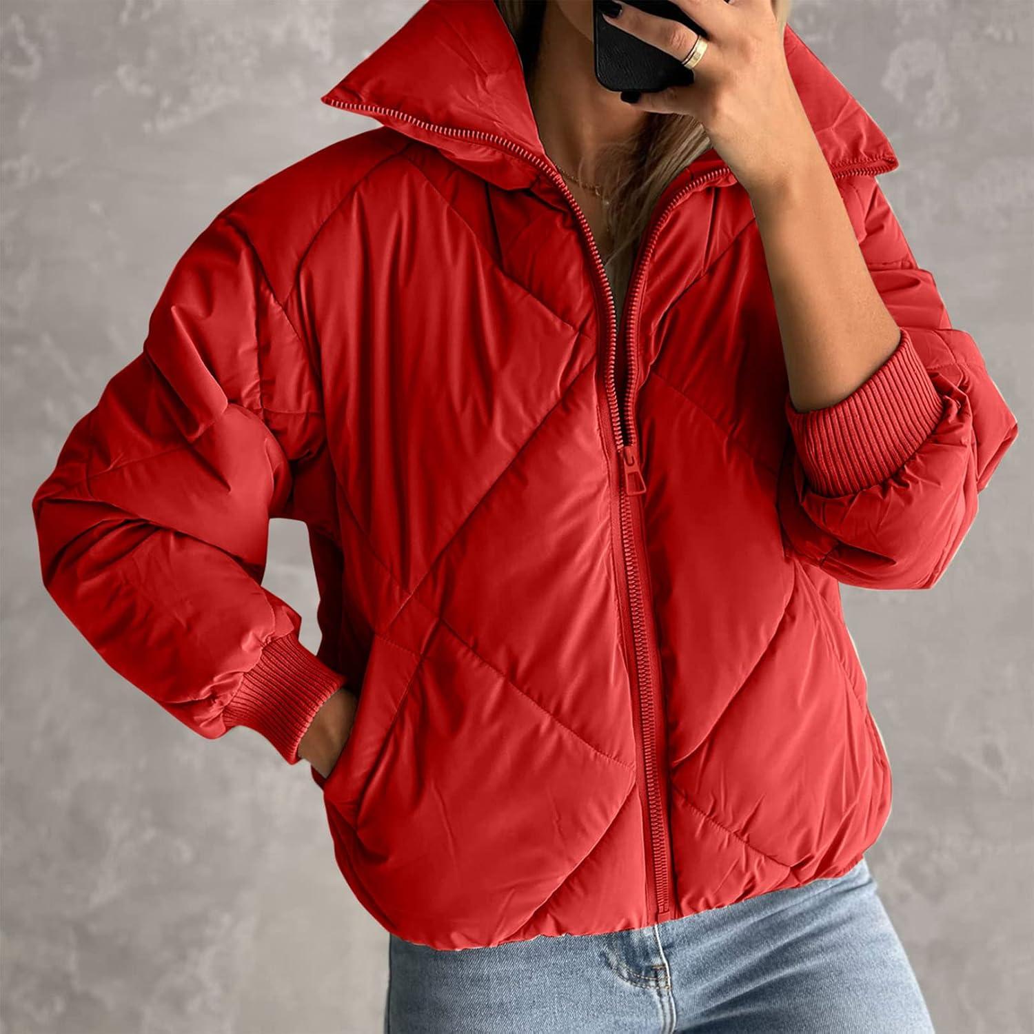 Women's long sleeve zipper puffy jacket quilted short down coat with pockets must in your wardrobe.
