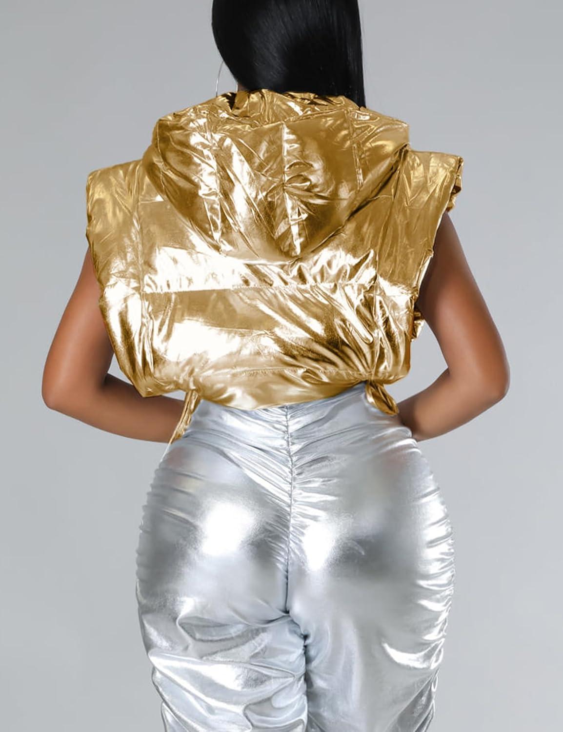 Flygo Women’s Winter Crop Vest Metallic Quilted Down Vest Sleeveless Puffer Jacket(02 Hooded Gold)