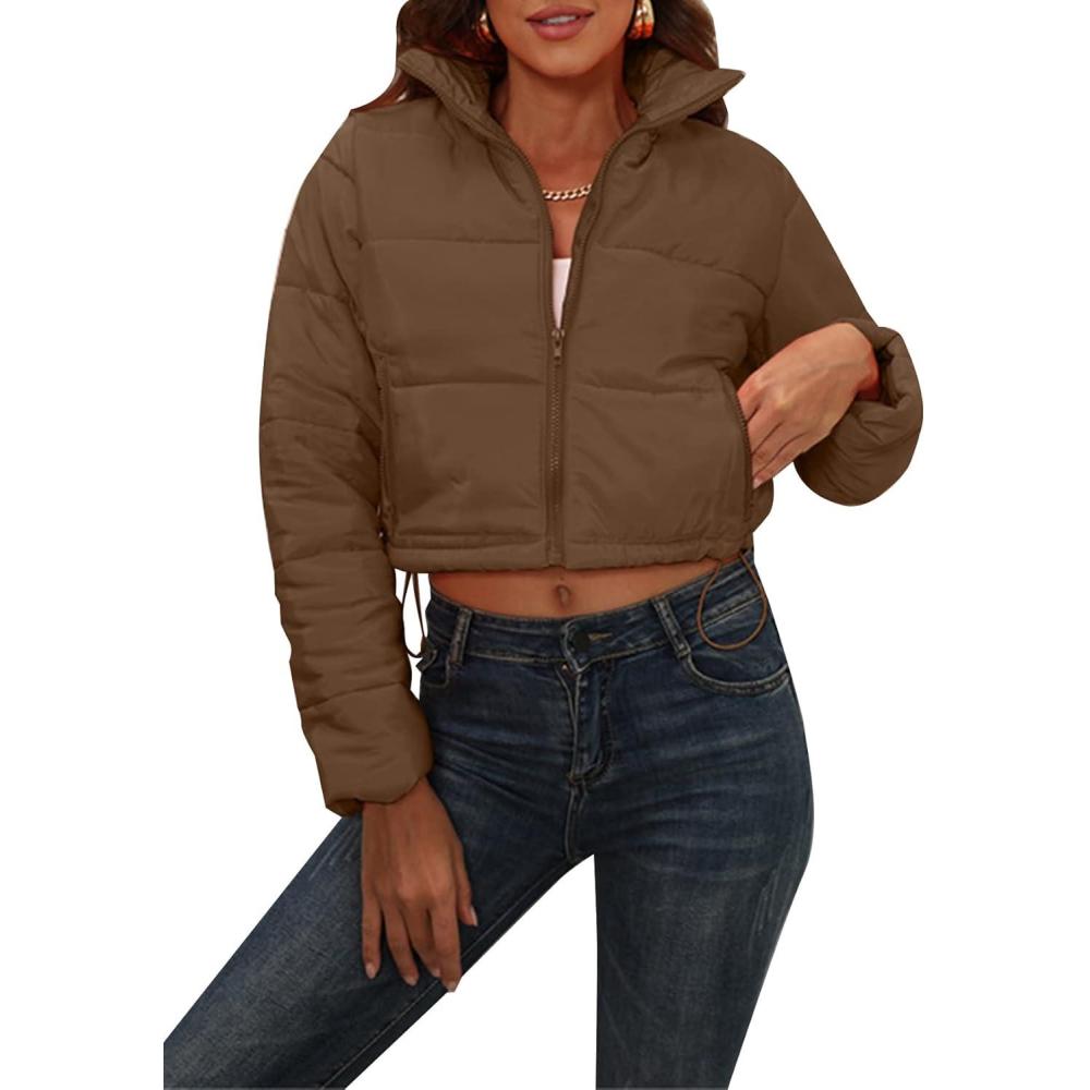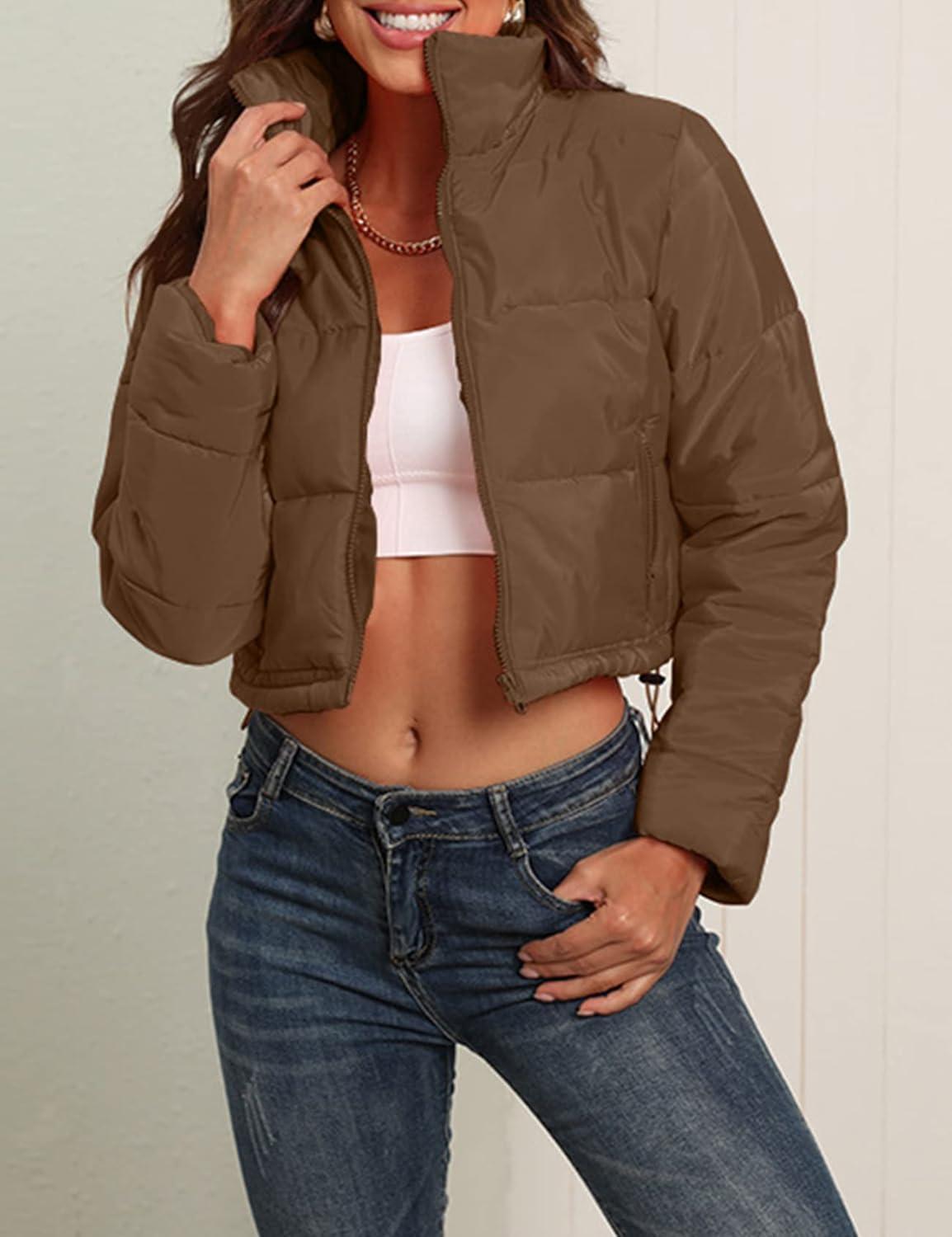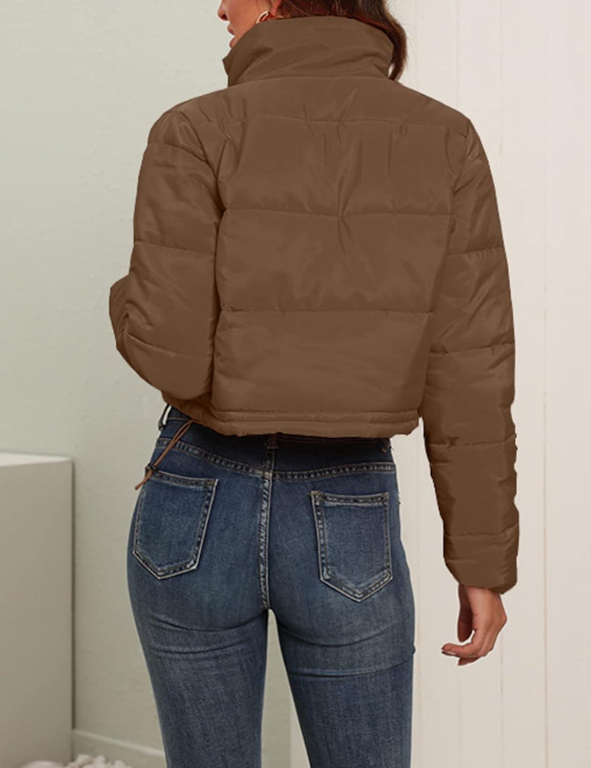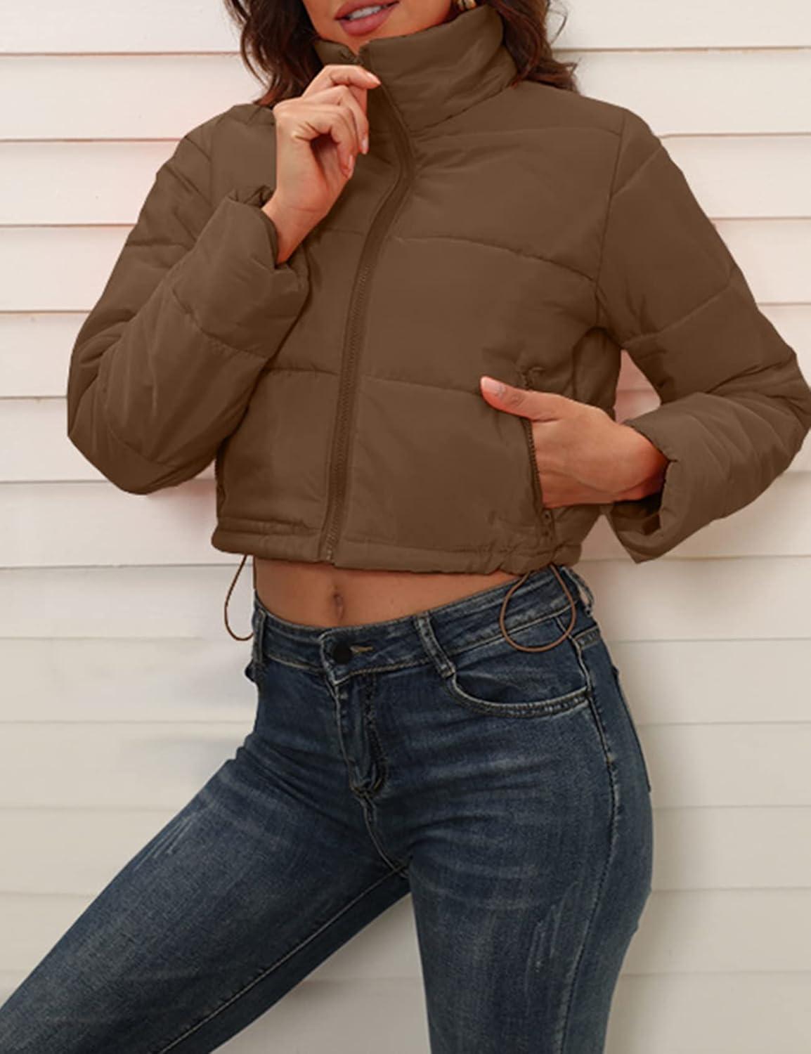Flygo Women’s Winter Cropped Puffer Jacket Zip Up Stand Collar Quilted Padded Coat(Brown)