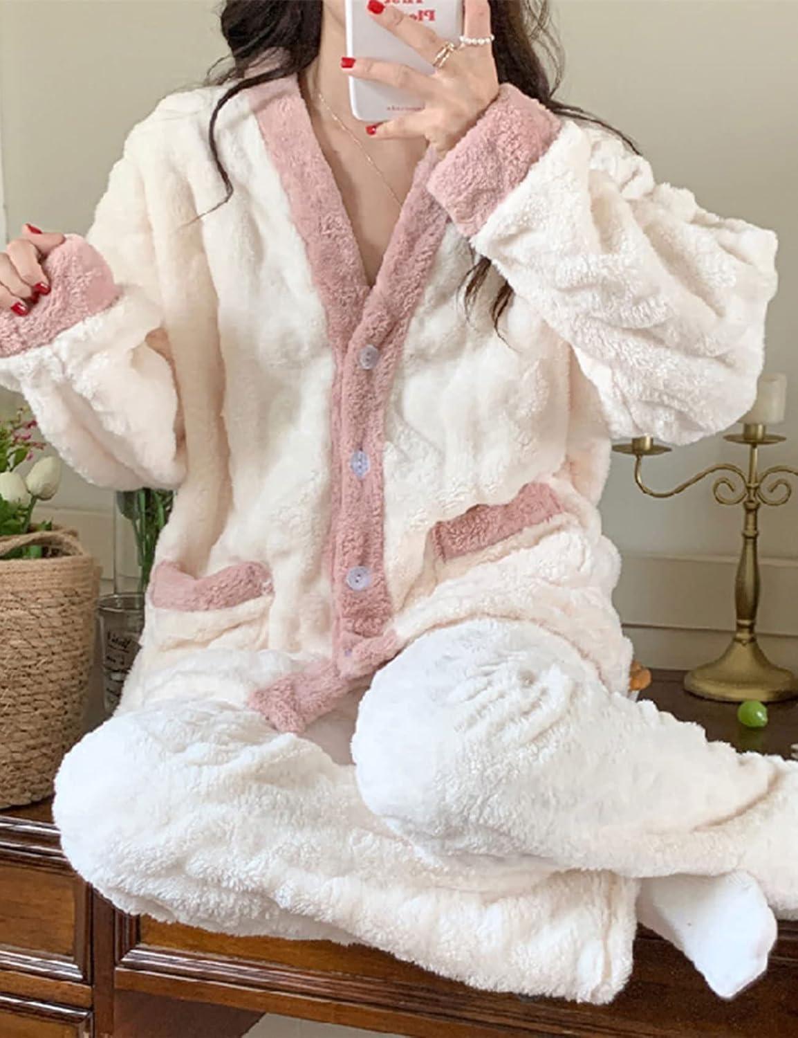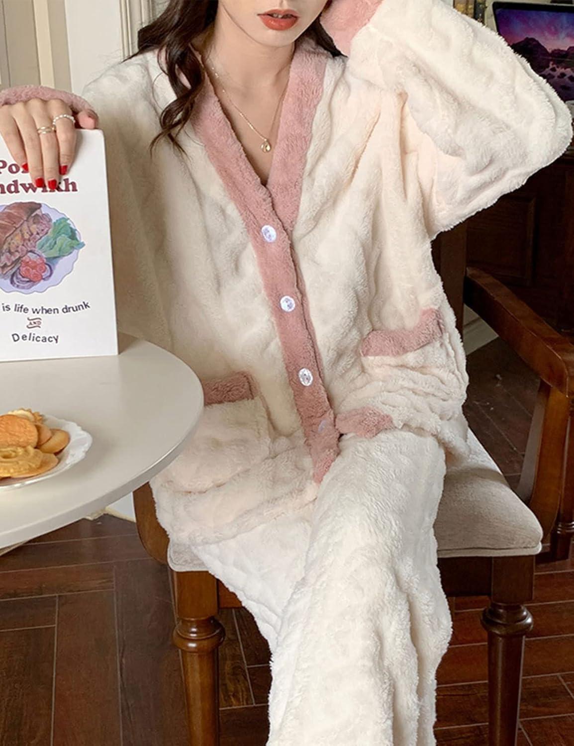 Flygo Women’s Winter Fluffy Pajamas Set Fleece Button Tops and Pants Plush Loungewear Sleepwear(Pink)