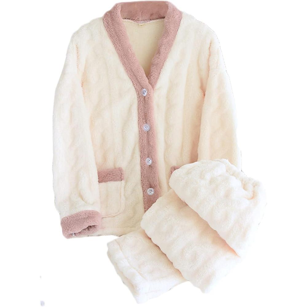 Flygo Women’s Winter Fluffy Pajamas Set Fleece Button Tops and Pants Plush Loungewear Sleepwear(Beige)