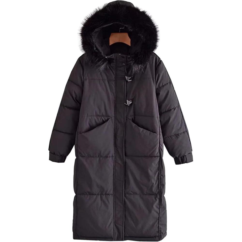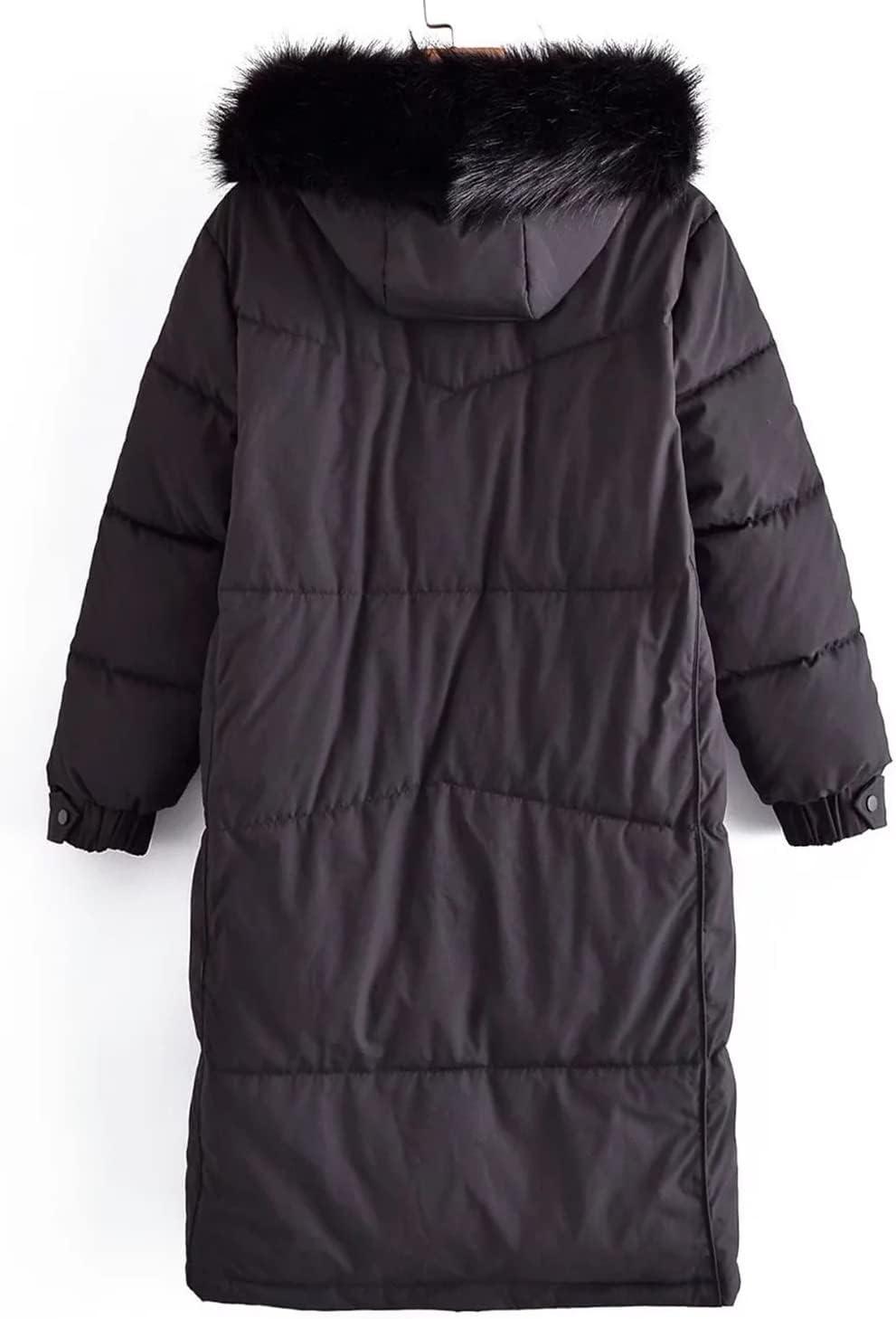 Flygo Women’s Winter Long Down Coat Padded Hooded Puffer Jacket with Fur Collar(Black)