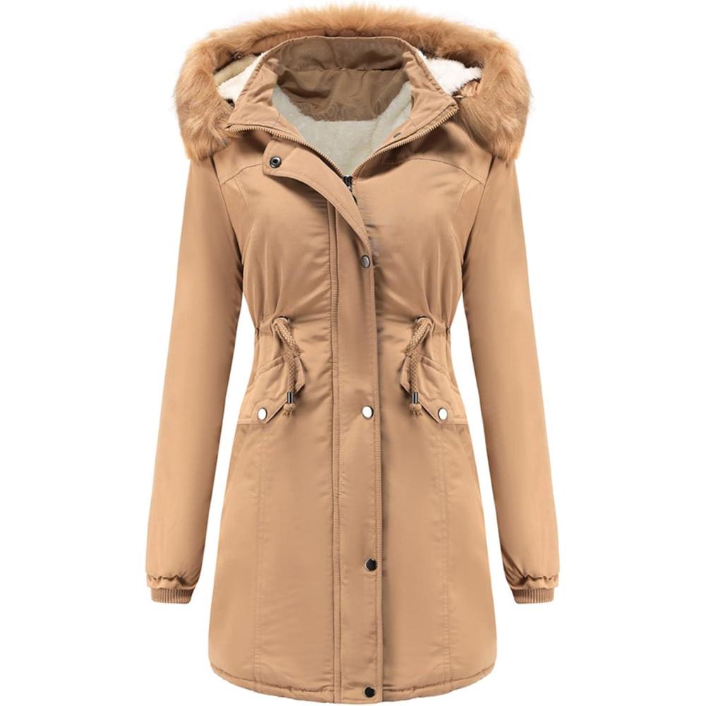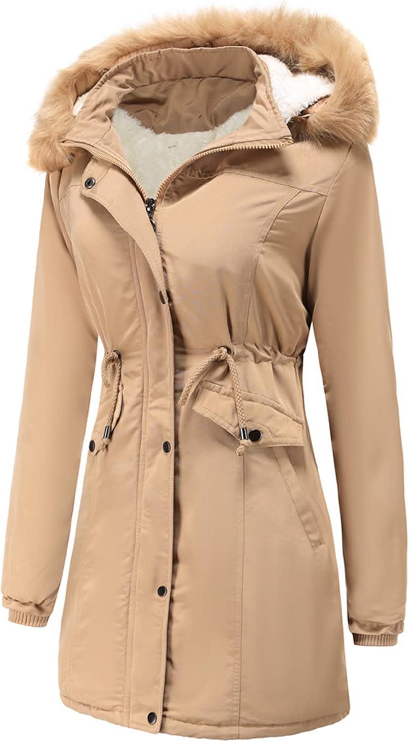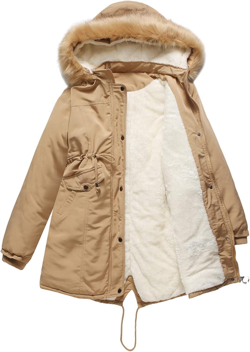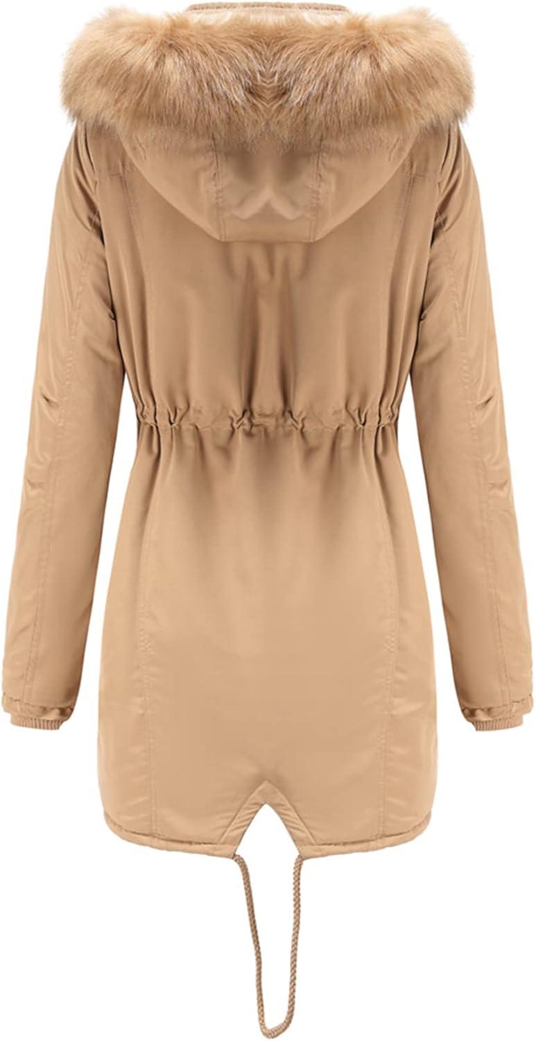 Flygo Women’s Winter Mid Long Hooded Sherpa Lined Parkas Anorak Coat with Faux Fur Collar(Khaki)