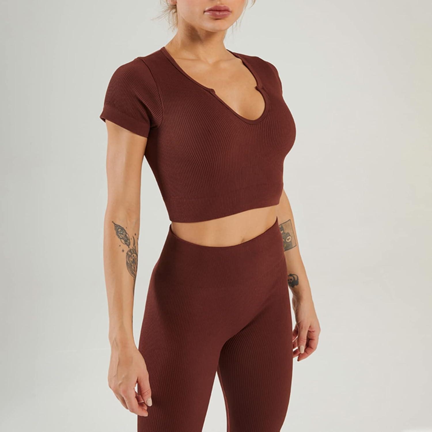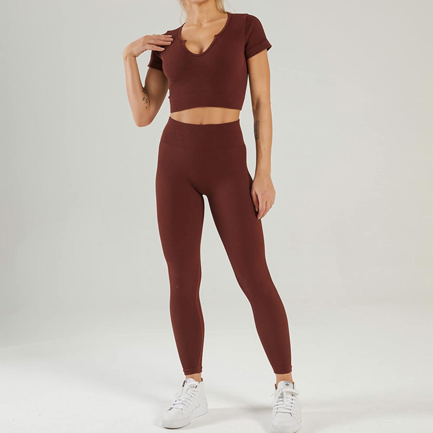 Flygo Workout Sets for Women 2 Piece Ribbed Seamless Crop Top High Waist Leggings Set Yoga Outfits(Coffee)