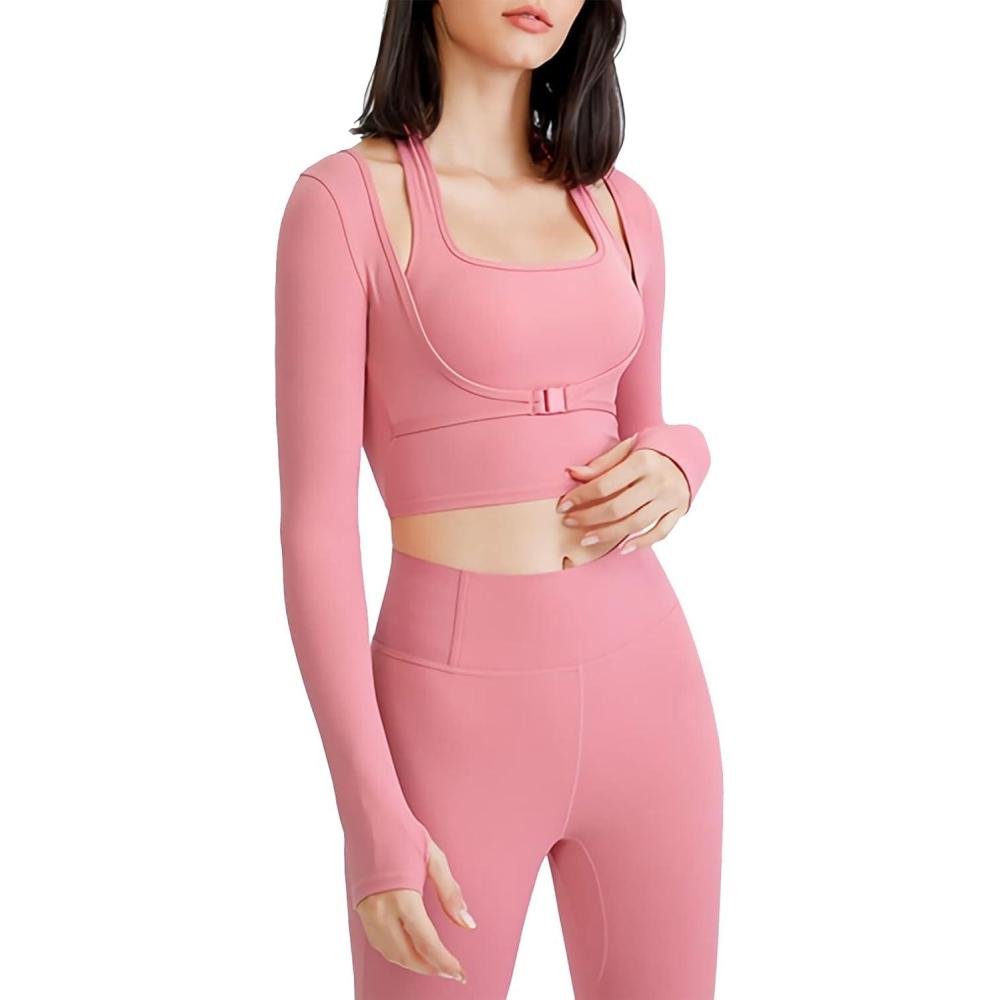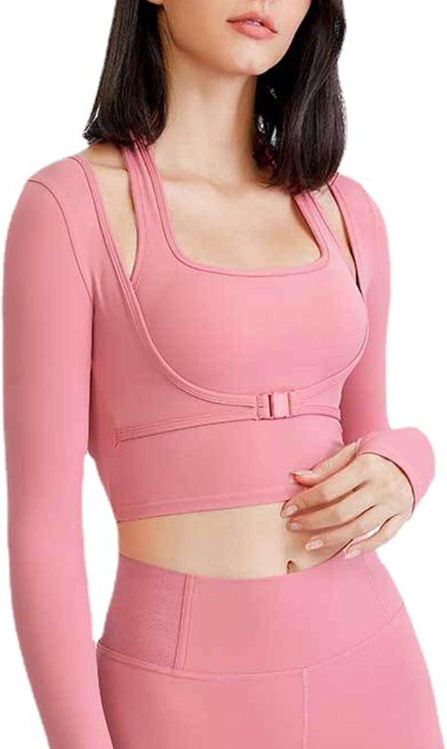 Flygo Yoga Shirts with Built in Bra Cutout Padded Crop Tops Long Sleeve Gym T Shirt for Women Workout(Pink)